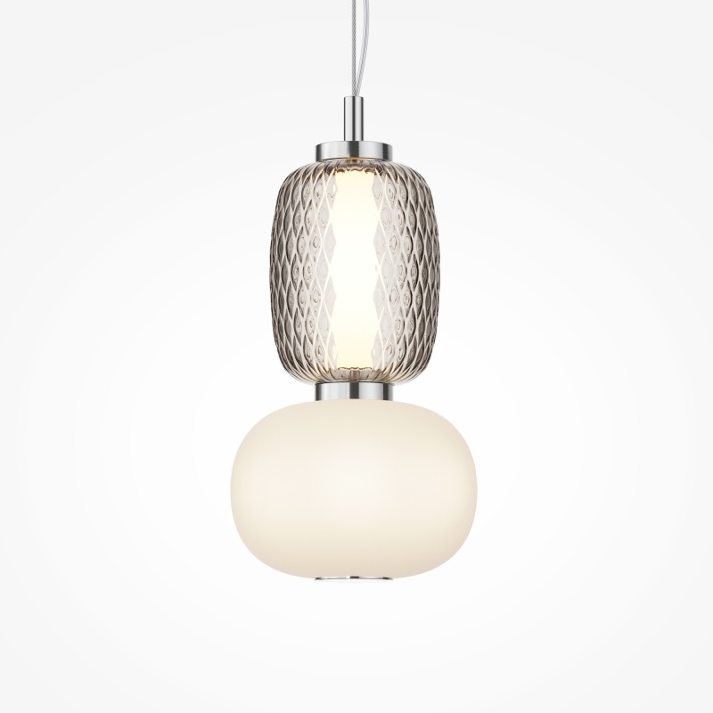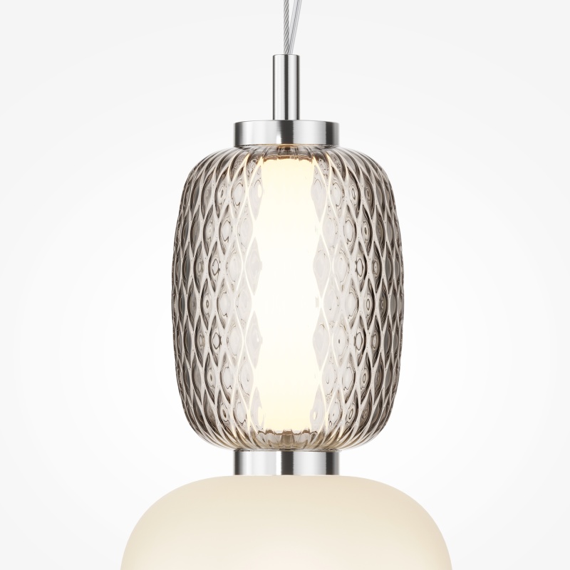 Металлическая арматура, цвет - золото, хром. Микс плафонов округлых и вытянутых форм из белого матового и прозрачного стекла с сетчатым и с линейным повторяющимся рельефным рисунком. Регулируемая высота подвесных моделей, провод - 3 метра. LED-источник света, цветовая температура 3000К.