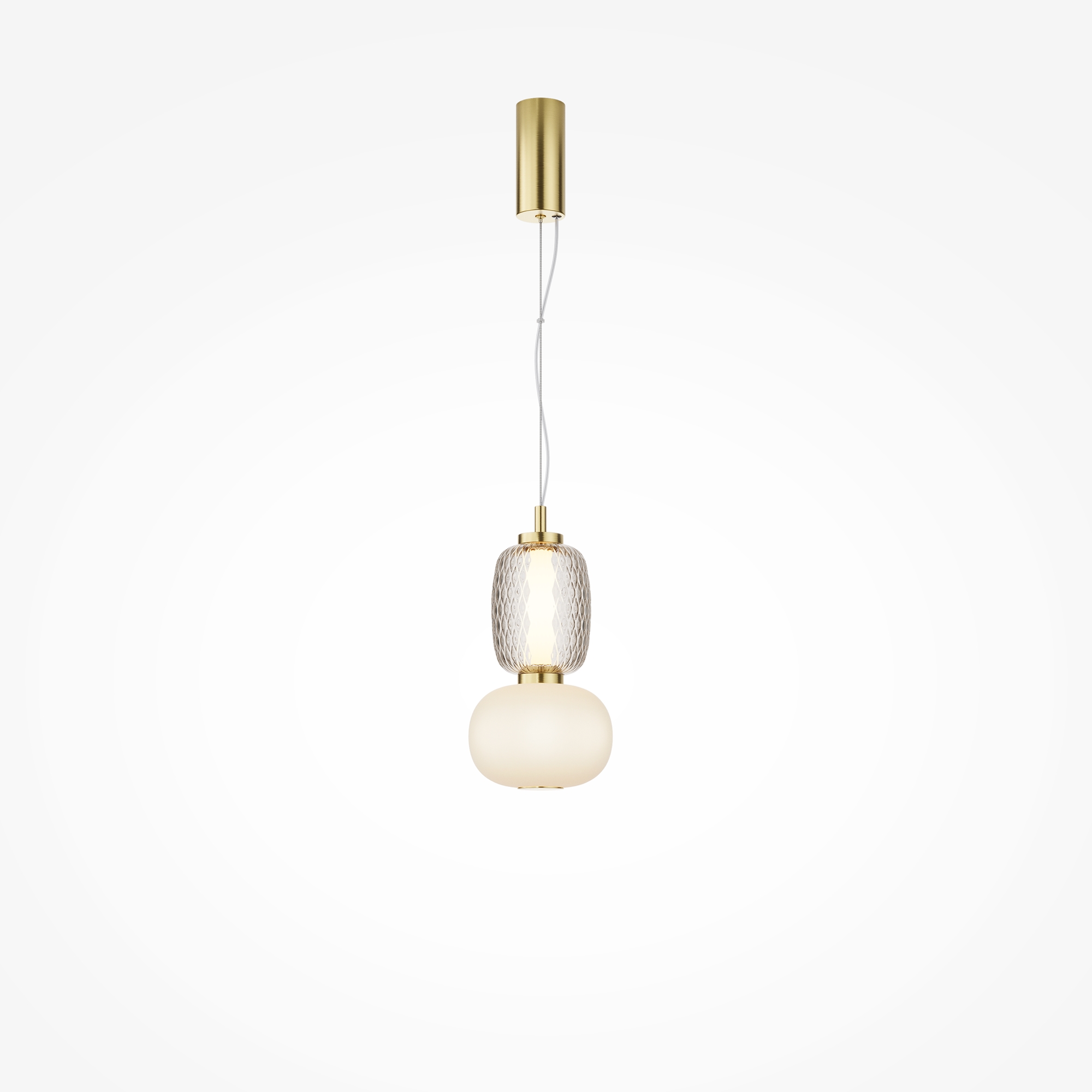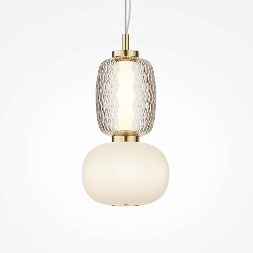 Металлическая арматура, цвет - золото, хром. Микс плафонов округлых и вытянутых форм из белого матового и прозрачного стекла с сетчатым и с линейным повторяющимся рельефным рисунком. Регулируемая высота подвесных моделей, провод - 3 метра. LED-источник света, цветовая температура 3000К.