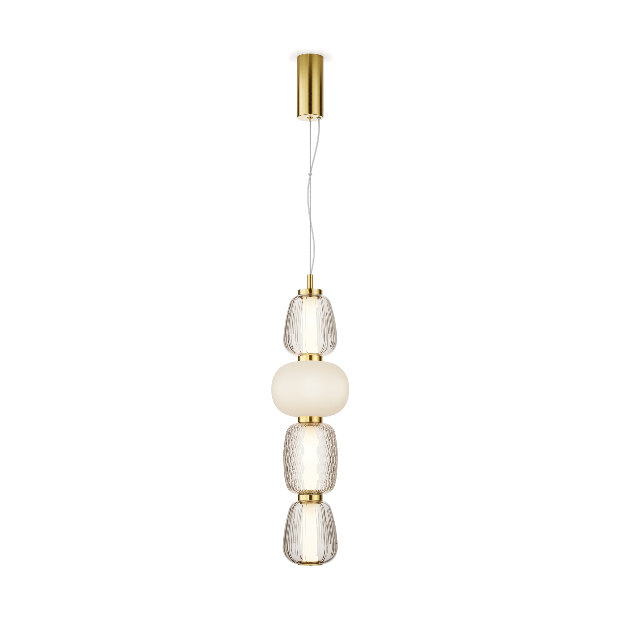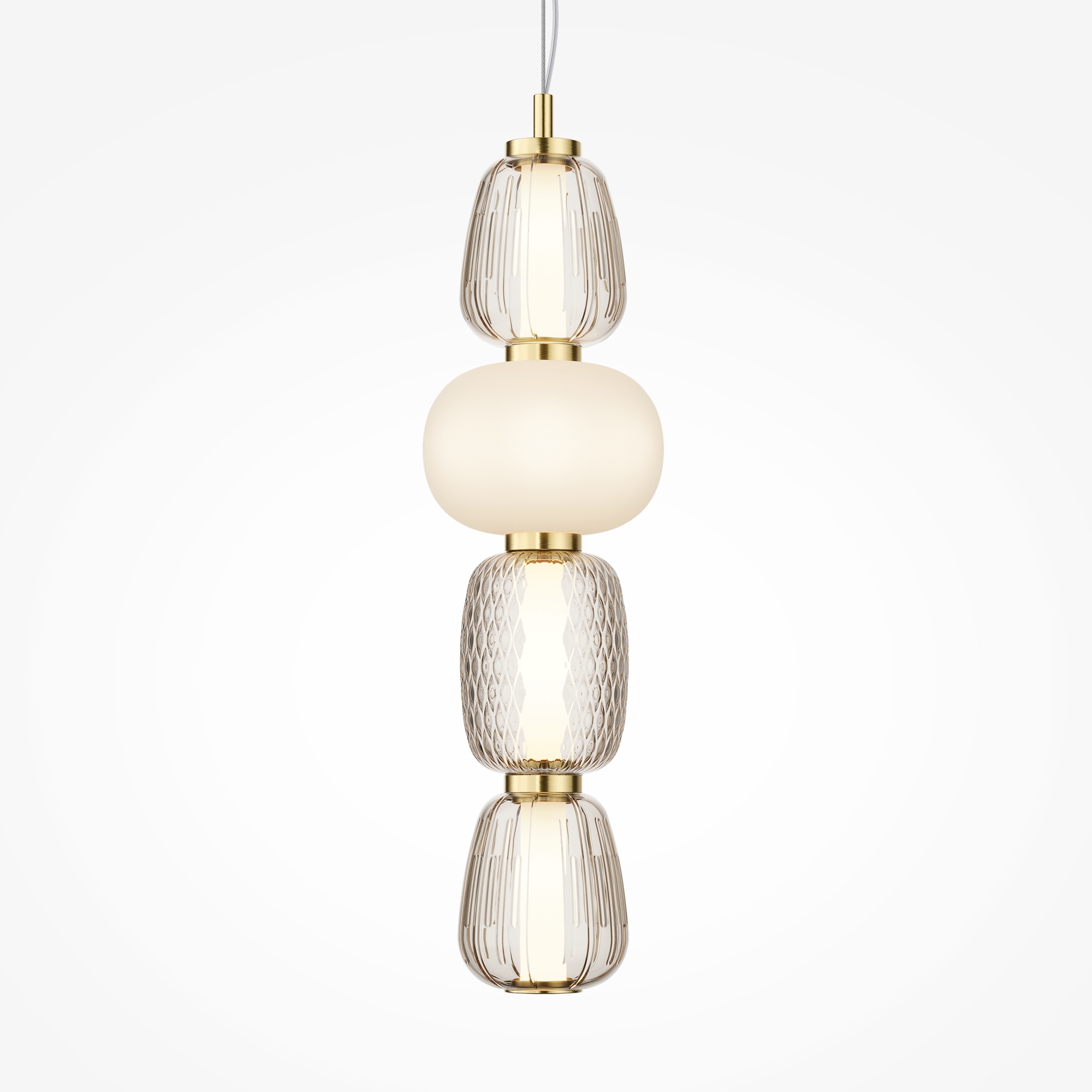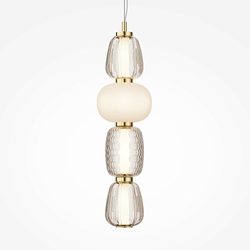 Металлическая арматура, цвет - золото, хром. Микс плафонов округлых и вытянутых форм из белого матового и прозрачного стекла с сетчатым и с линейным повторяющимся рельефным рисунком. Регулируемая высота подвесных моделей, провод - 3 метра. LED-источник света, цветовая температура 3000К.