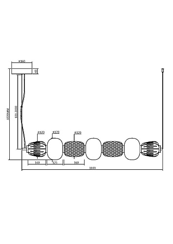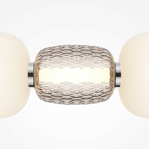 Металлическая арматура, цвет - золото, хром. Микс плафонов округлых и вытянутых форм из белого матового и прозрачного стекла с сетчатым и с линейным повторяющимся рельефным рисунком. Регулируемая высота подвесных моделей, провод - 3 метра. LED-источник света, цветовая температура 3000К.