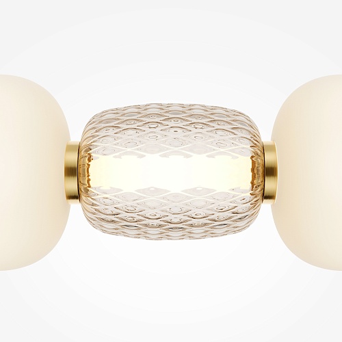 Металлическая арматура, цвет - золото, хром. Микс плафонов округлых и вытянутых форм из белого матового и прозрачного стекла с сетчатым и с линейным повторяющимся рельефным рисунком. Регулируемая высота подвесных моделей, провод - 3 метра. LED-источник света, цветовая температура 3000К.
