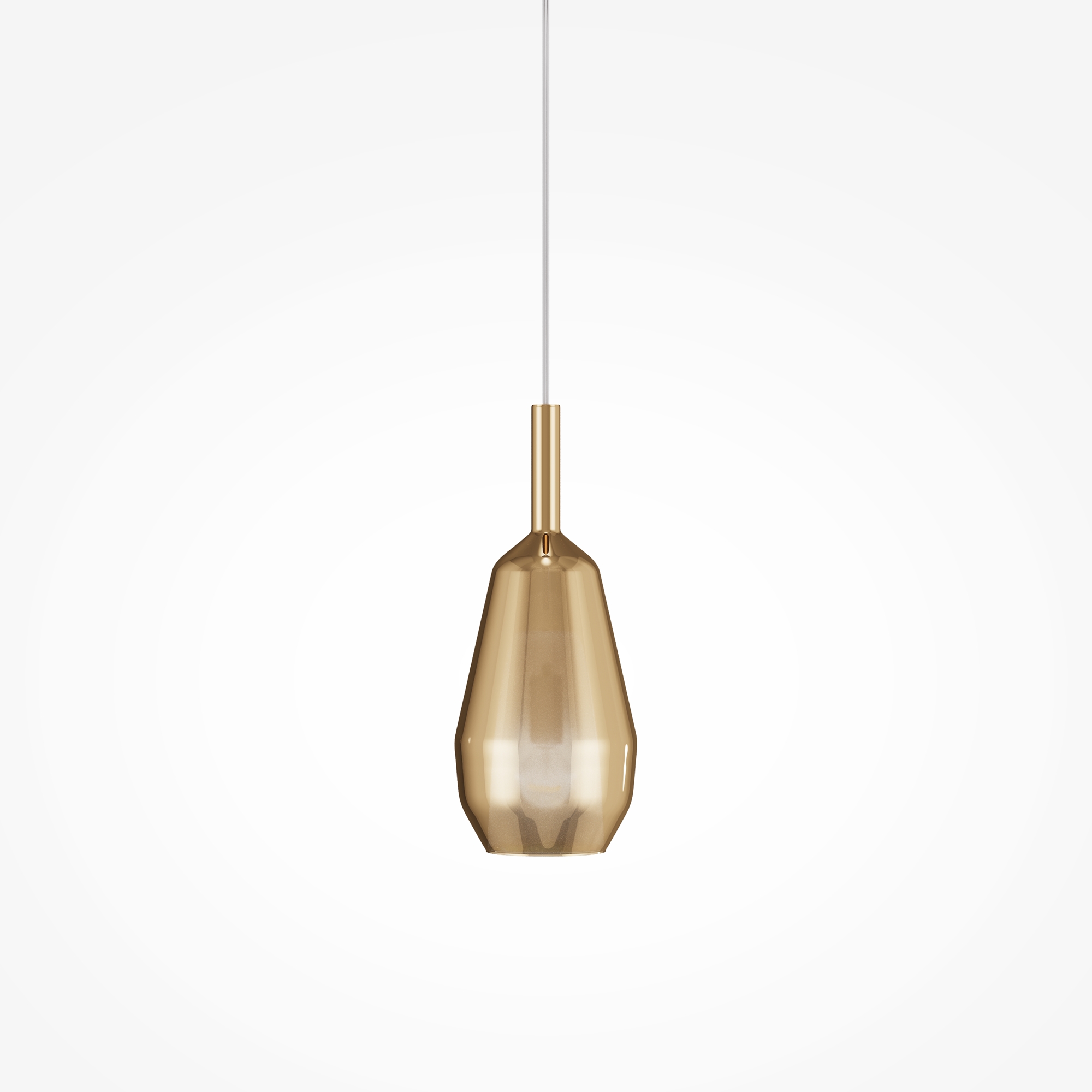 Металлическое основание, цвет - черный. Плафоны из двойного стекла. Внутренний прозрачный в форме конуса. Внешний плафон в трех геометрических формах, цвет стекла: зеркальные золотой, кофейный, дымчатый. Регулируемая длина провода - 3 метра. Источник света - лампа с цоколем Е27.