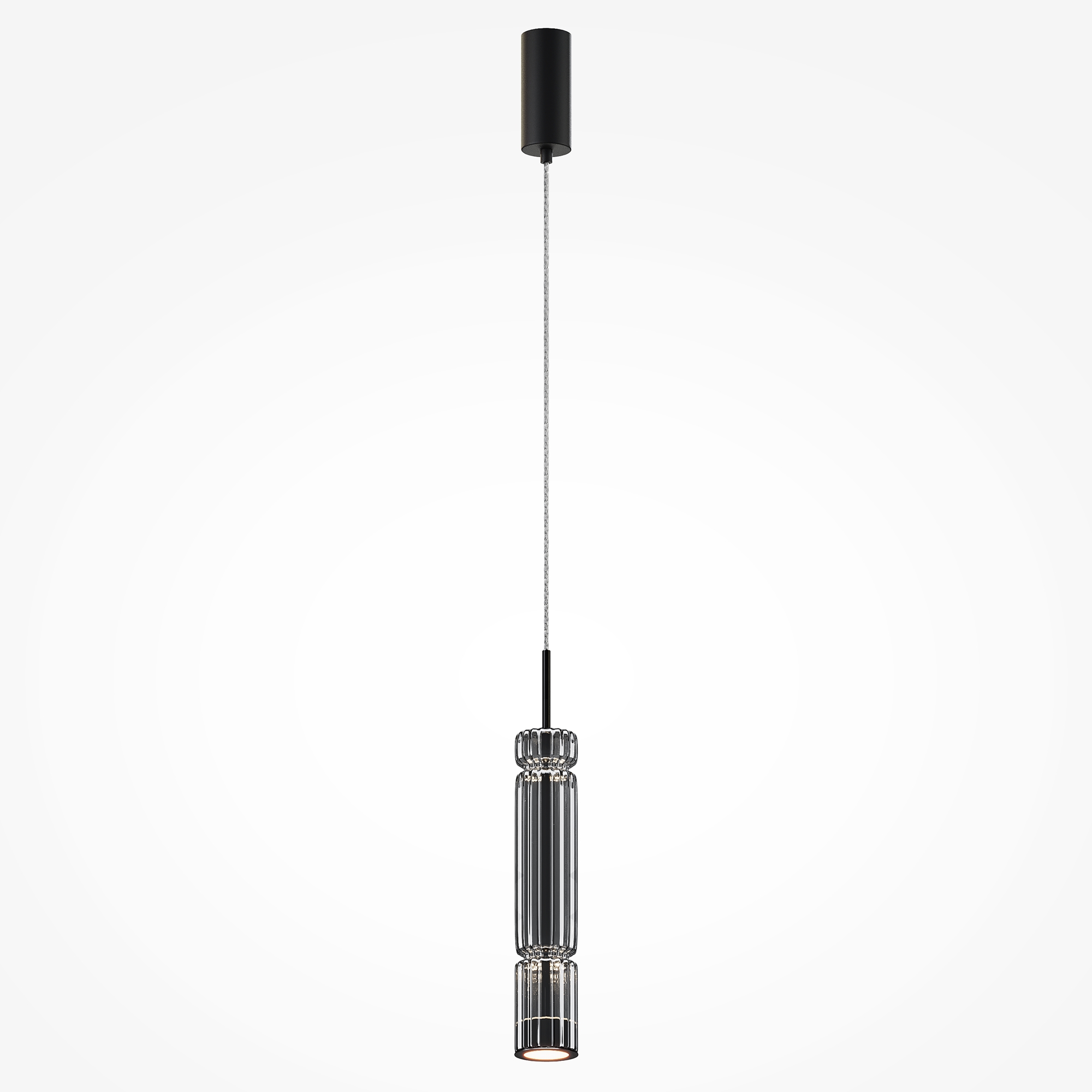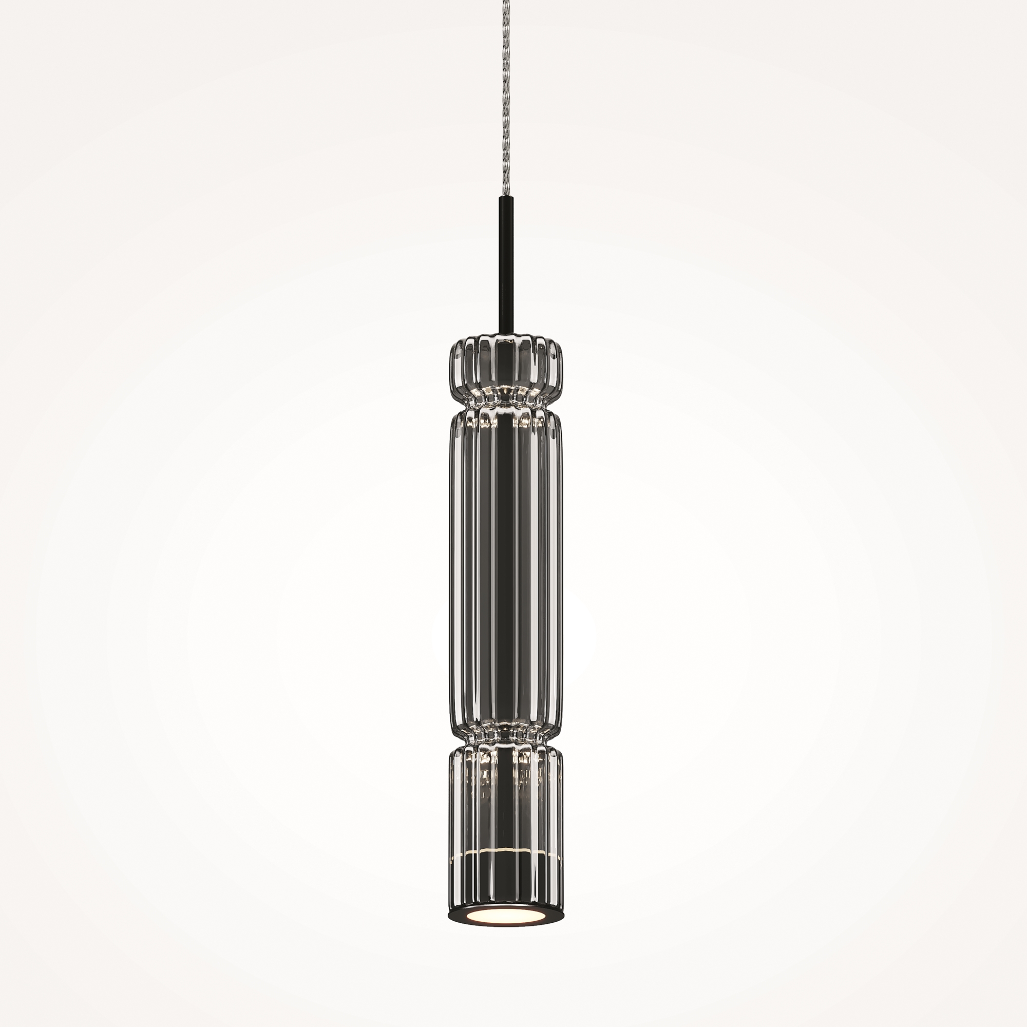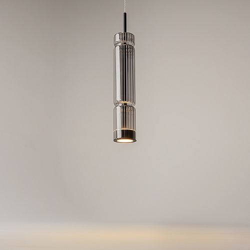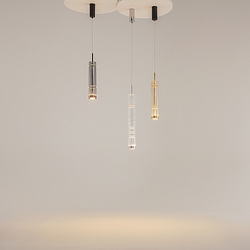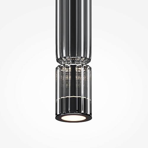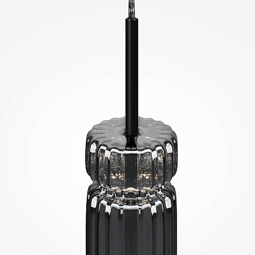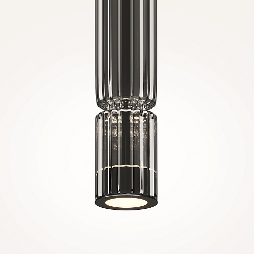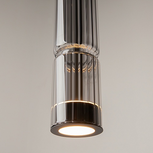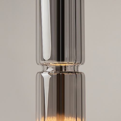 Арматура - металл, цвет - хром, черный. Цилиндрические плафоны из стекла с вертикальным рельефным рисунком в трех оттенках: прозрачный, коньячный, дымчатый. Метафора древнегреческих храмовых колонн в образе светильников. LED-источник света. Цветовая температура 3000К.