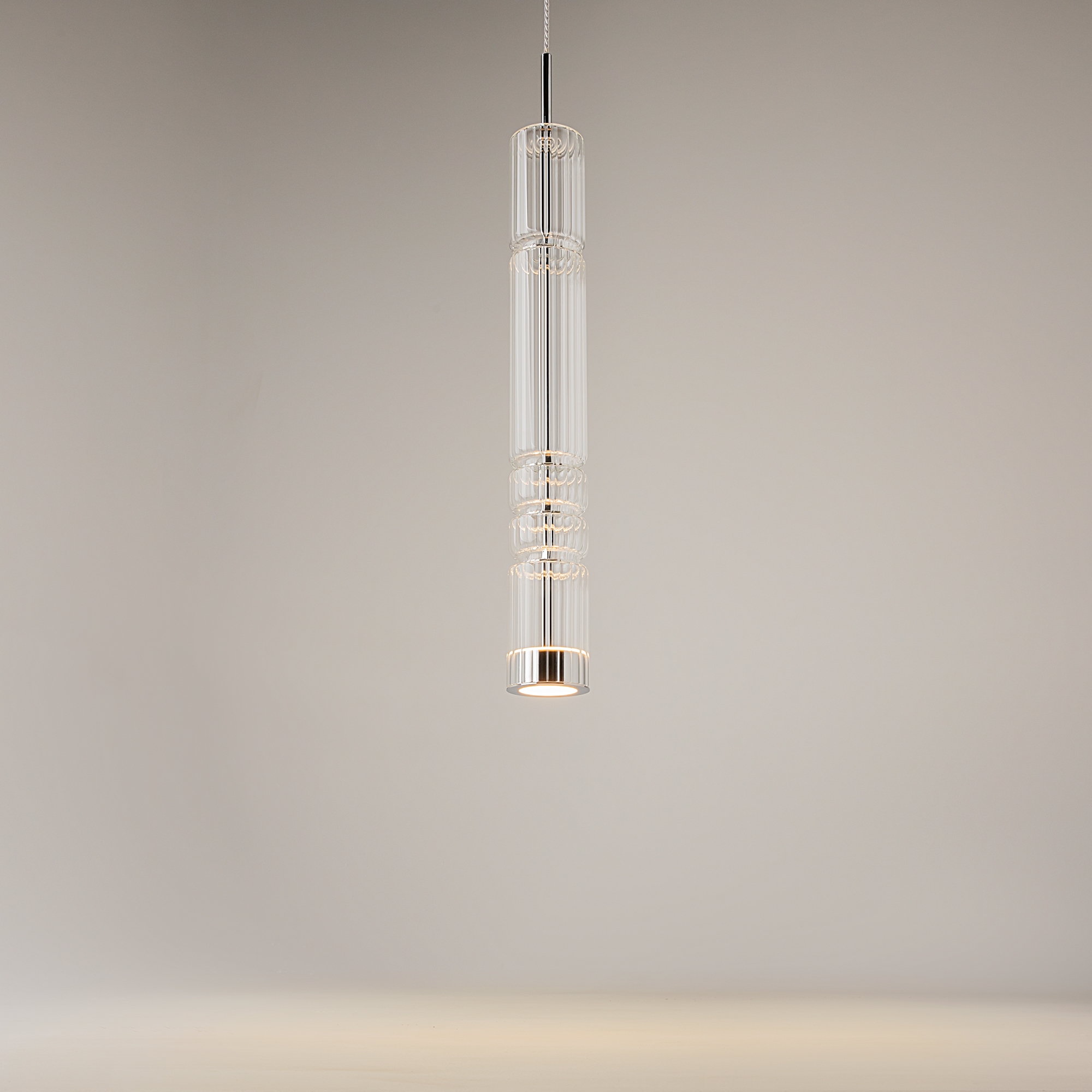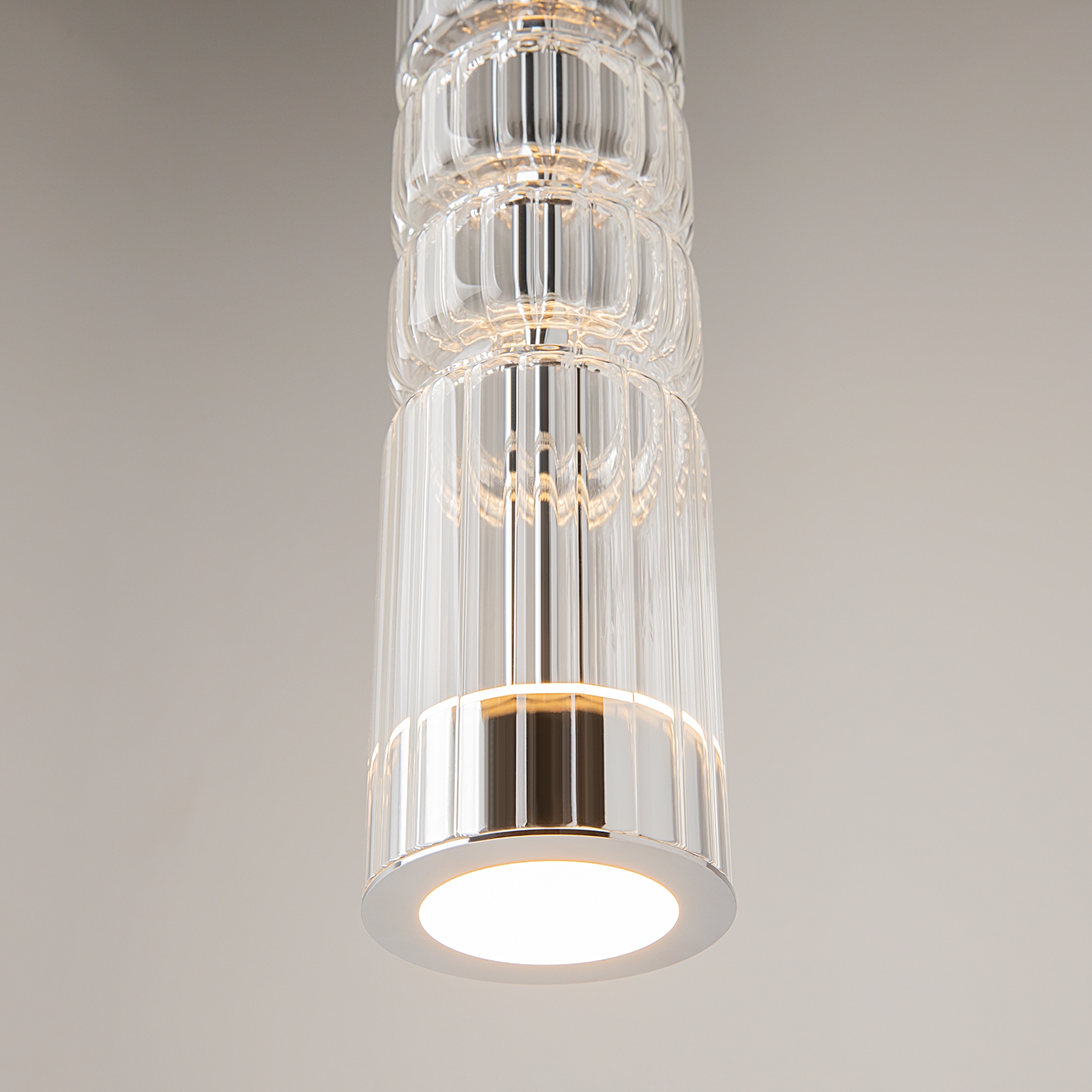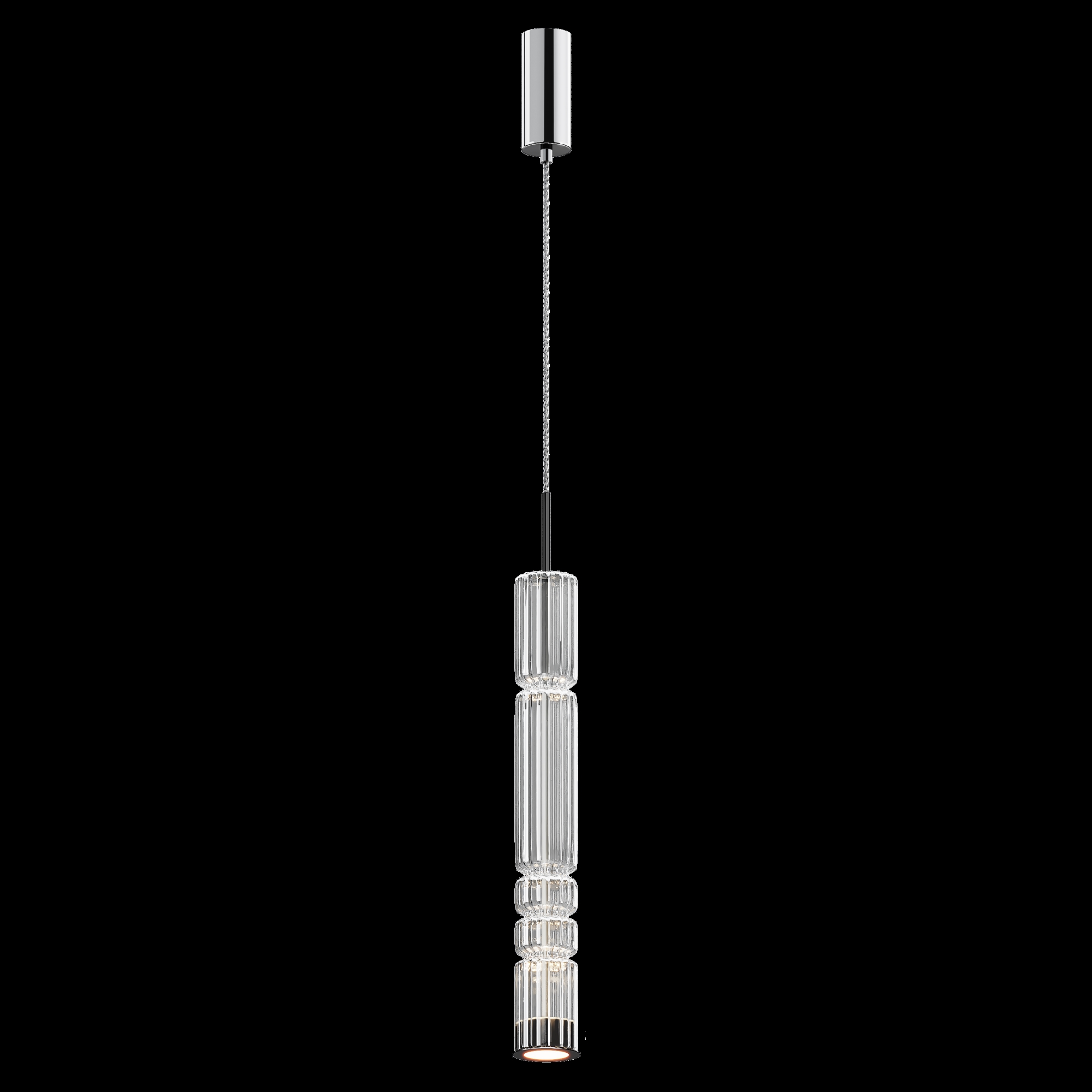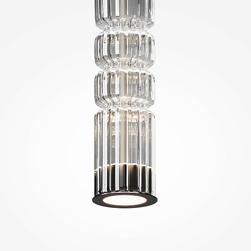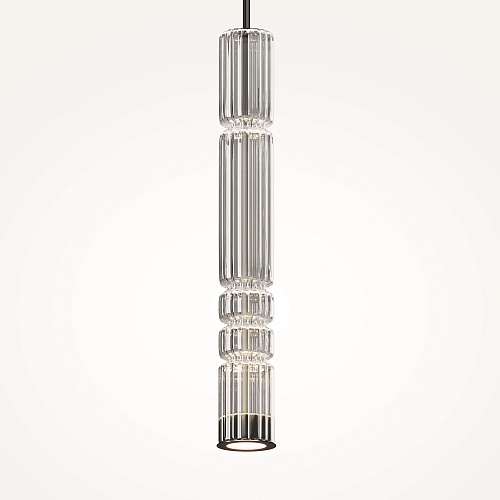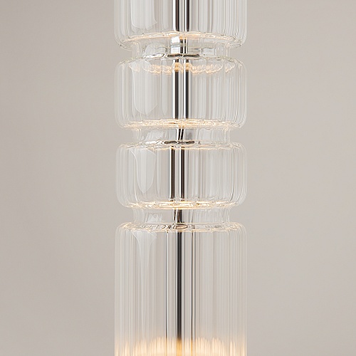 Арматура - металл, цвет - хром, черный. Цилиндрические плафоны из стекла с вертикальным рельефным рисунком в трех оттенках: прозрачный, коньячный, дымчатый. Метафора древнегреческих храмовых колонн в образе светильников. LED-источник света. Цветовая температура 3000К.