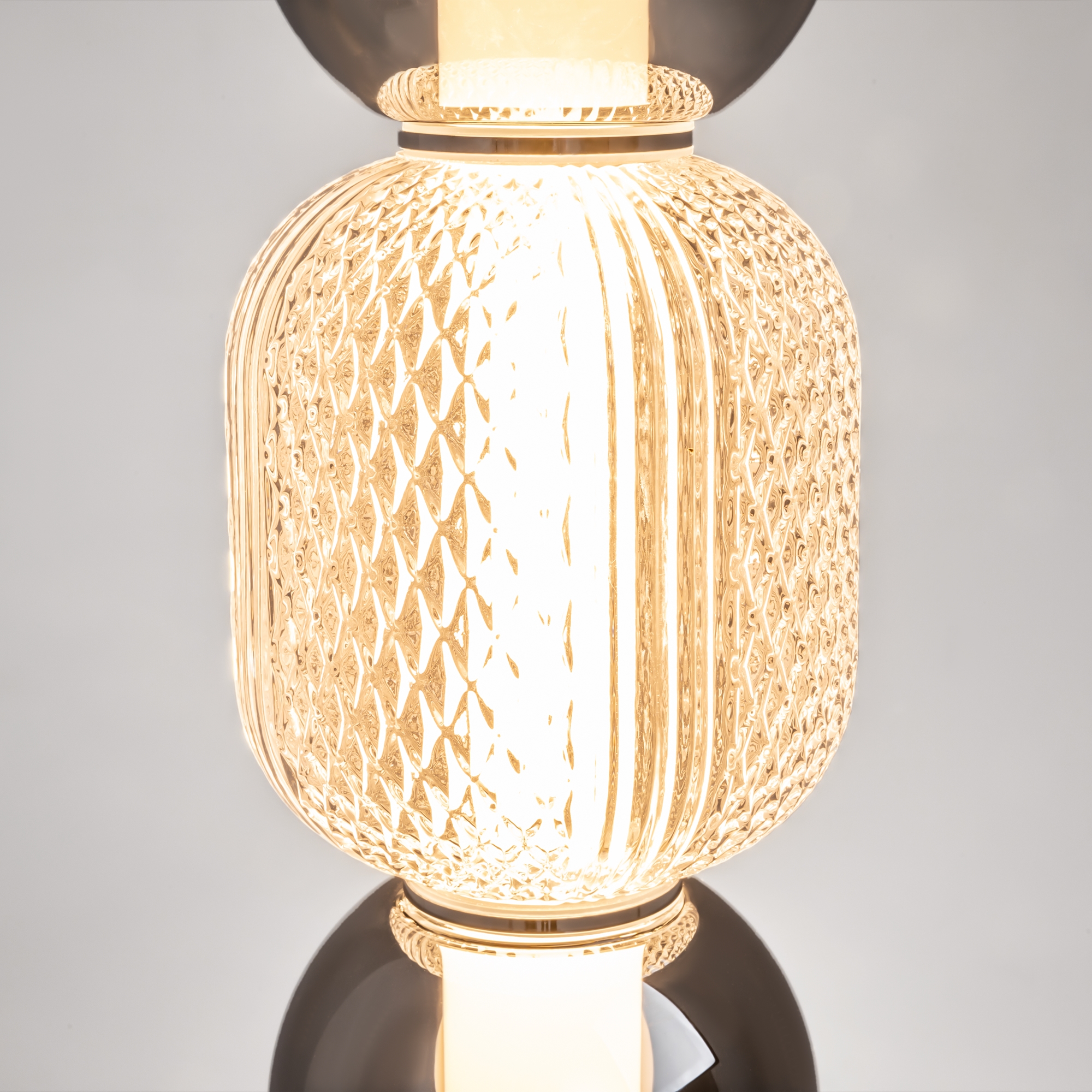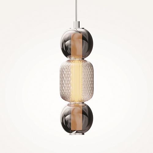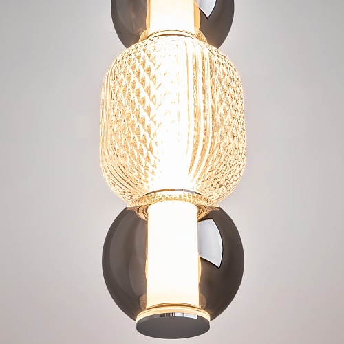 Материал арматуры - металл, цвета - золото, хром. Микс плафонов: гладкие cферы коньячного или дымчатого оттенка + округлые рельефные с ромбовидным узором из прозрачного стекла. Регулируемая высота подвесных моделей - максимальная длина провода 3 метра. LED-источник света, цветовая температура 3000К