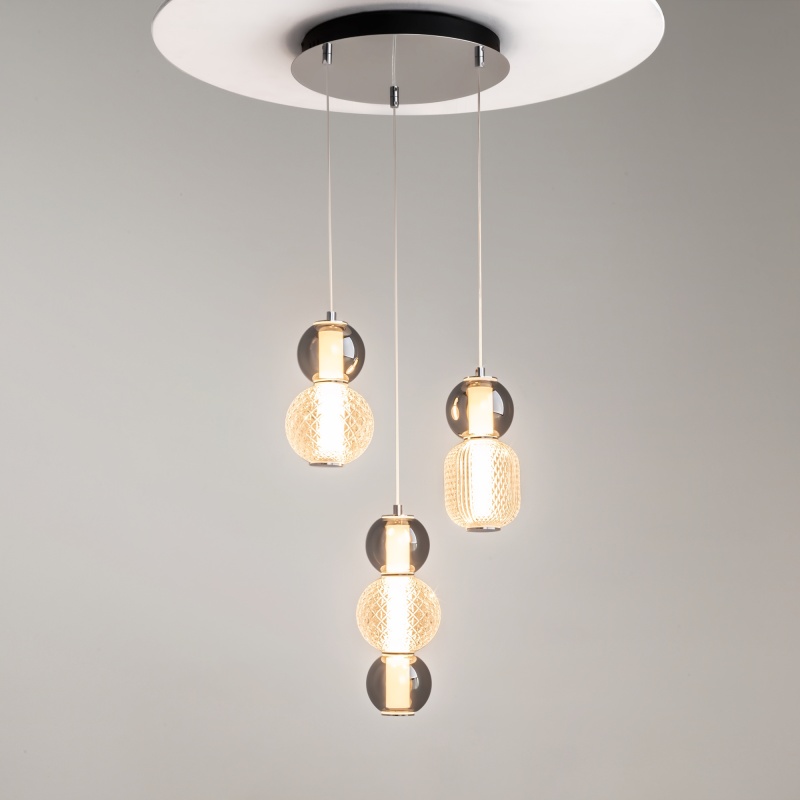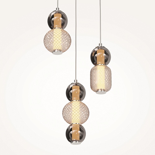 Материал арматуры - металл, цвета - золото, хром. Микс плафонов: гладкие cферы коньячного или дымчатого оттенка + округлые рельефные с ромбовидным узором из прозрачного стекла. Регулируемая высота подвесных моделей - максимальная длина провода 3 метра. LED-источник света, цветовая температура 3000К