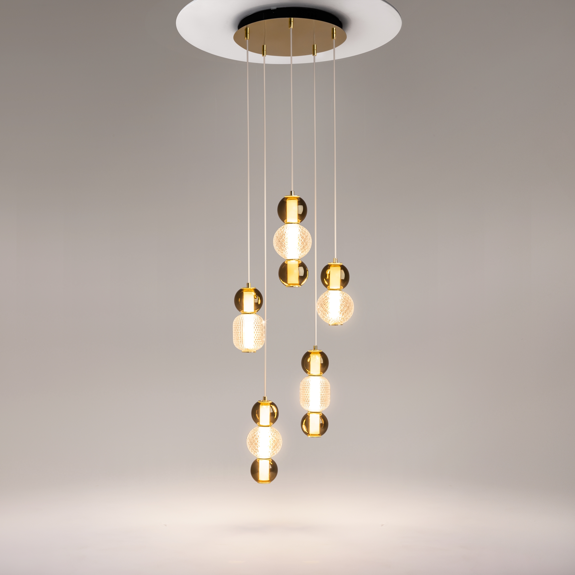 Материал арматуры - металл, цвета - золото, хром. Микс плафонов: гладкие cферы коньячного или дымчатого оттенка + округлые рельефные с ромбовидным узором из прозрачного стекла. Регулируемая высота подвесных моделей - максимальная длина провода 3 метра. LED-источник света, цветовая температура 3000К