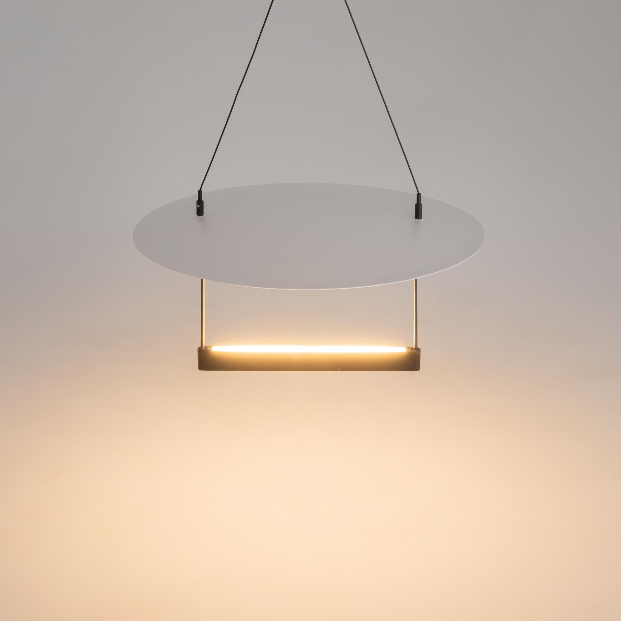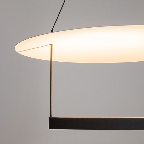 Арматура из алюминия, цвет - черный. Круглый и плоский металлический плафон, цвет - белый. Эффект отраженного и рассеянного света для основного освещения. Два диаметра рассеивателя. Регулируемая длина проводов - 3 метра. LED-источник света. Цветовая температура 3000К.