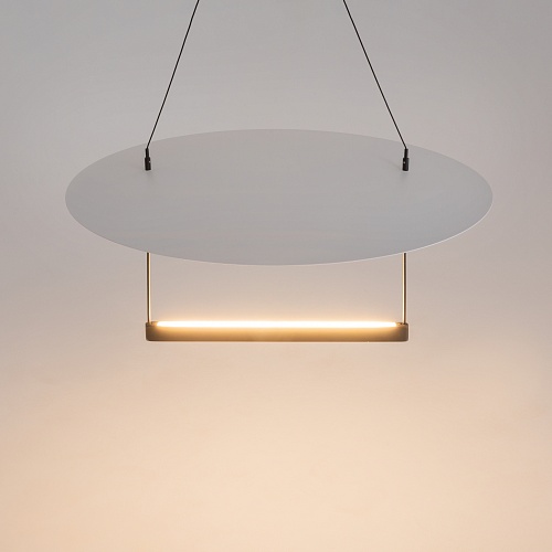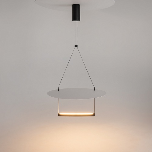 Арматура из алюминия, цвет - черный. Круглый и плоский металлический плафон, цвет - белый. Эффект отраженного и рассеянного света для основного освещения. Два диаметра рассеивателя. Регулируемая длина проводов - 3 метра. LED-источник света. Цветовая температура 3000К.