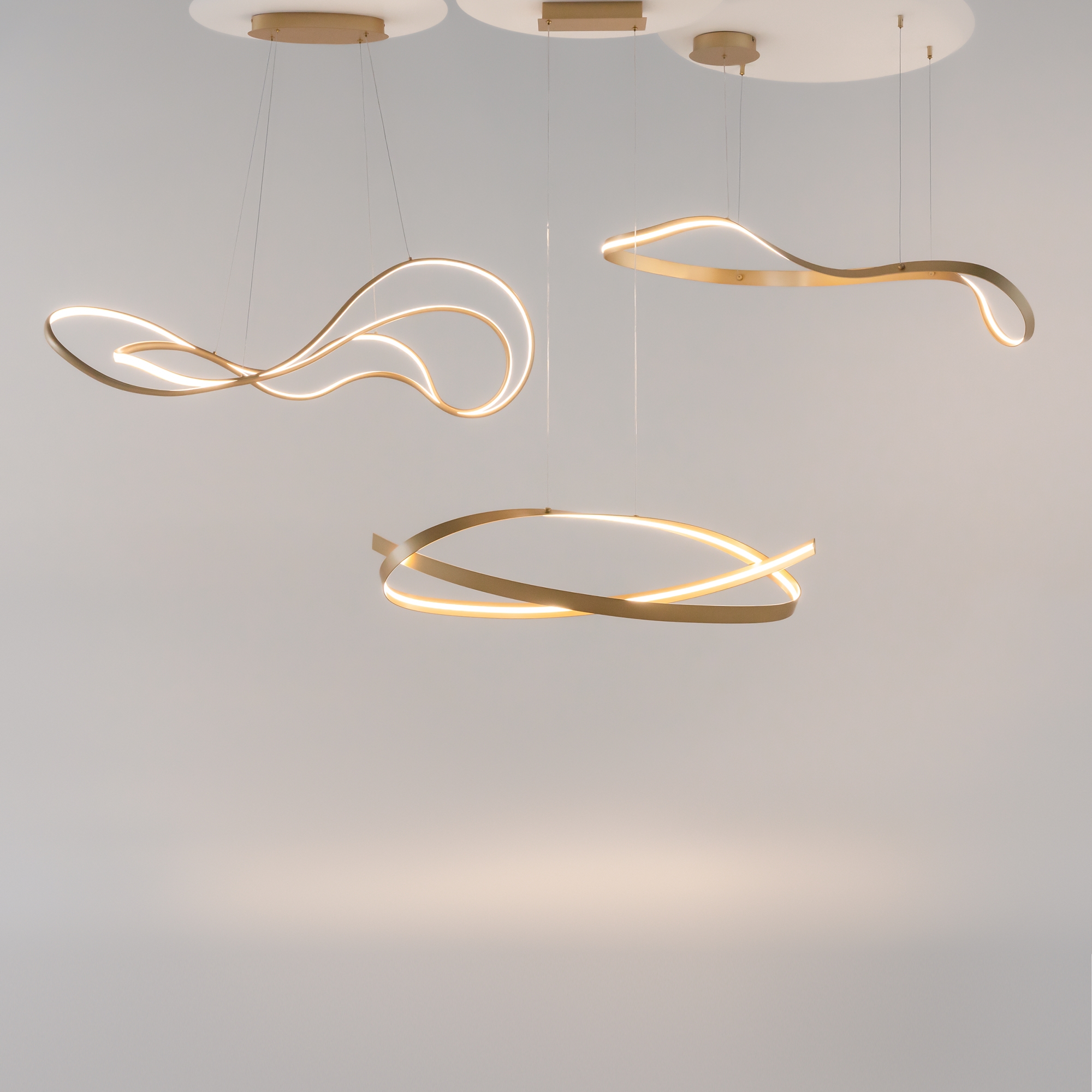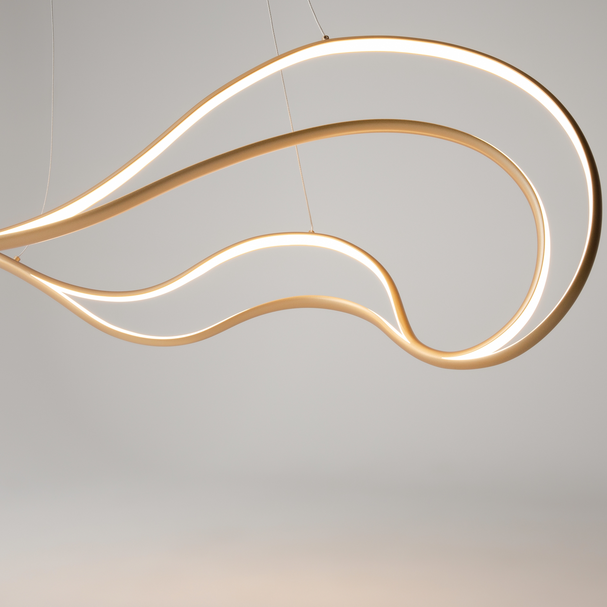 Материал арматуры — алюминий, цвет латунь. Силиконовый рассеиватель. LED-источник света, цветовая температура 3000К. Регулируемый провод у подвесных моделей - 3 метра.