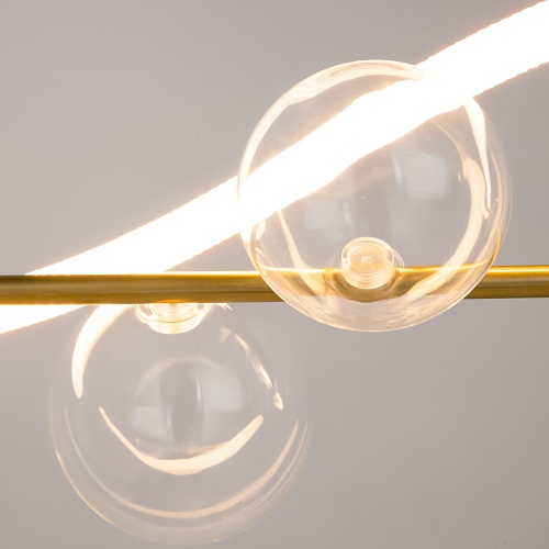 Арматура из металла цвета латуни, материал рассеивателя – текстильный жгут, декоративные элементы выполнены из прозрачного выдувного стекла. LED-источник света. Цветовая температура 3000К, угол рассеивания света 360°. Вертикальное настенное бра включается touch-сенсором. Тканевый шнур. Высота подвесных светильников регулируется.