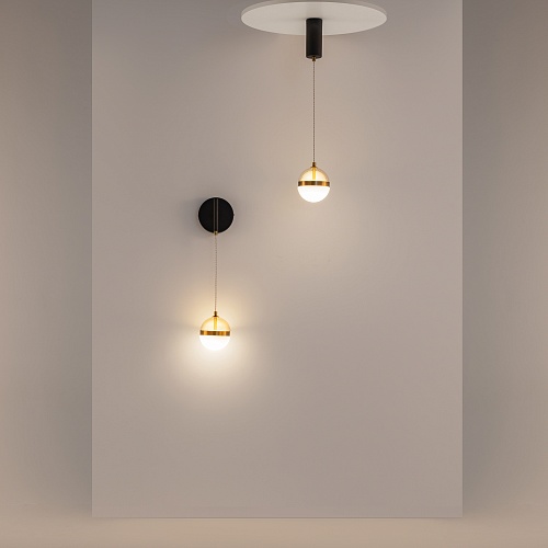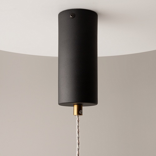 Черная потолочная чаша дополнена финишным антибликовым покрытием sandy, декоративный элемент плафона выполнен из металла цвета сатинированной латуни. Сочетание двух фактурных стекол в плафоне: нижняя полусфера из матового белого стекла для создания мягкого рассеянного света, верхняя часть плафона - из тонированного янтарного стекла. Внутри установлен LED-модуль, создающий равномерное освещение, направленное вверх и вниз. Цветовая температура – 3000К, угол рассеивания — 120°.