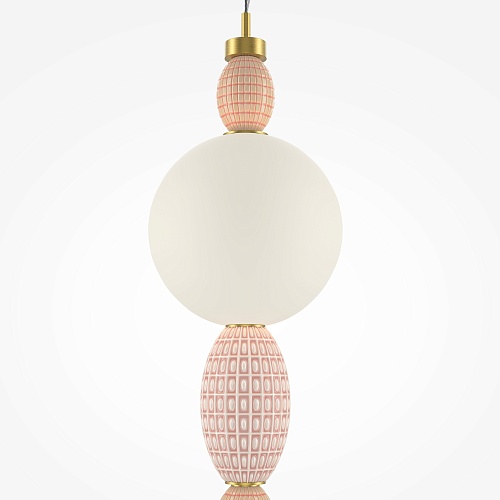 Металлическая арматура цвета латуни. Плафоны из белого стекла для мягкого, равномерного освещения, декоративные элементы из цветной керамики. Угол рассеивания 120°. Цветовая температура – 3000 К. Регулируемый провод длиной 3 м.