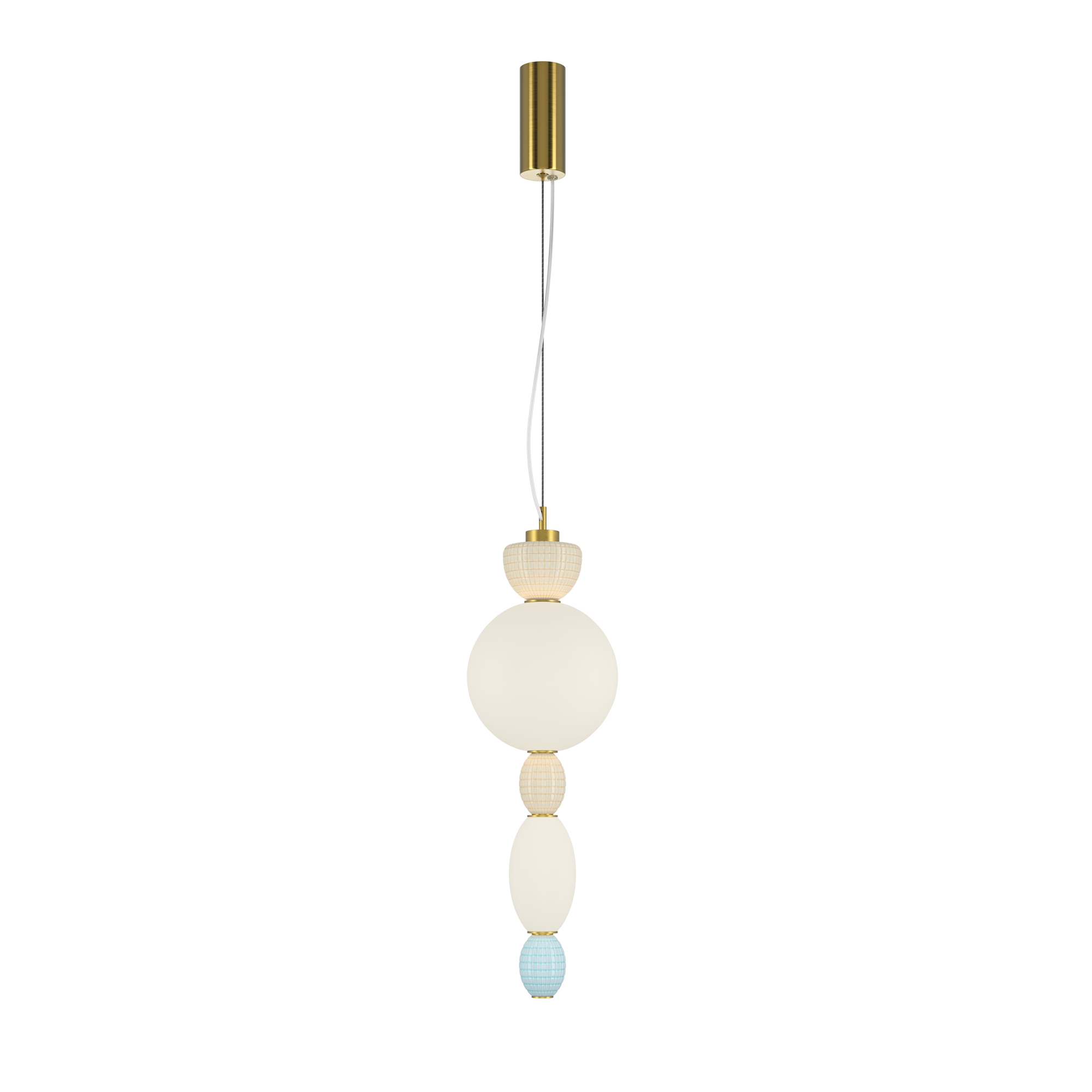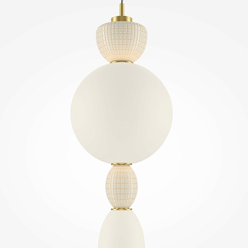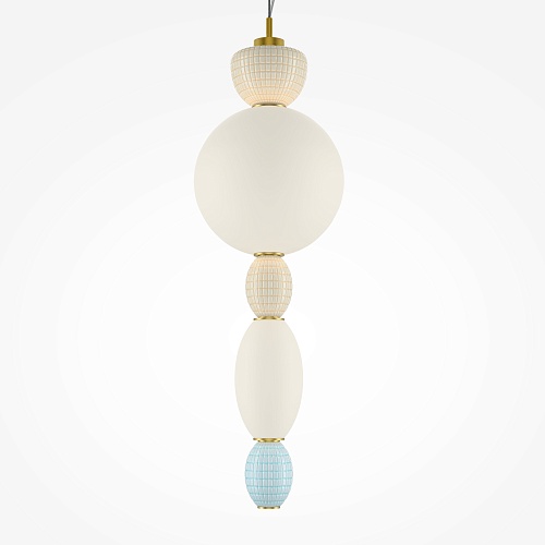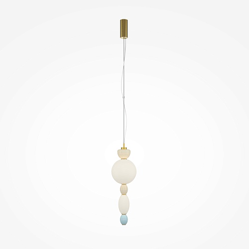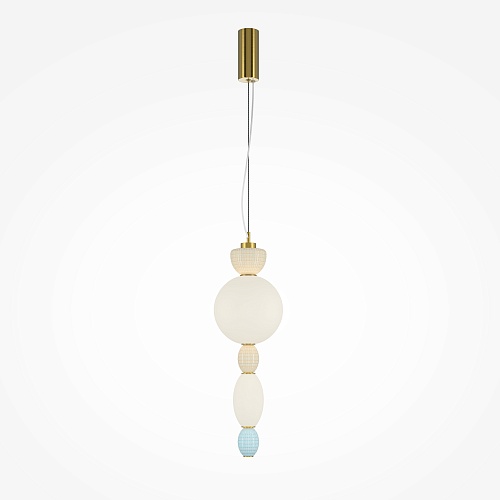 Металлическая арматура цвета латуни. Плафоны из белого стекла для мягкого, равномерного освещения, декоративные элементы из цветной керамики. Угол рассеивания 120°. Цветовая температура – 3000 К. Регулируемый провод длиной 3 м.