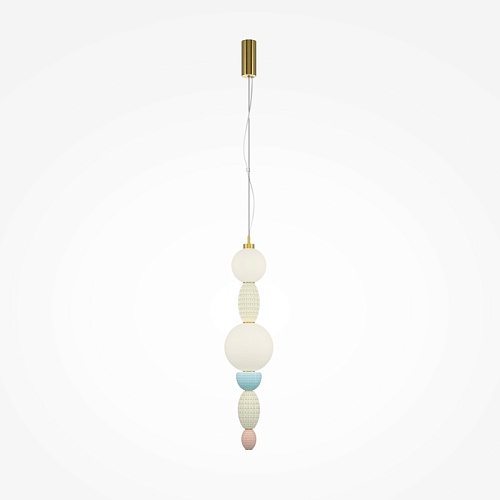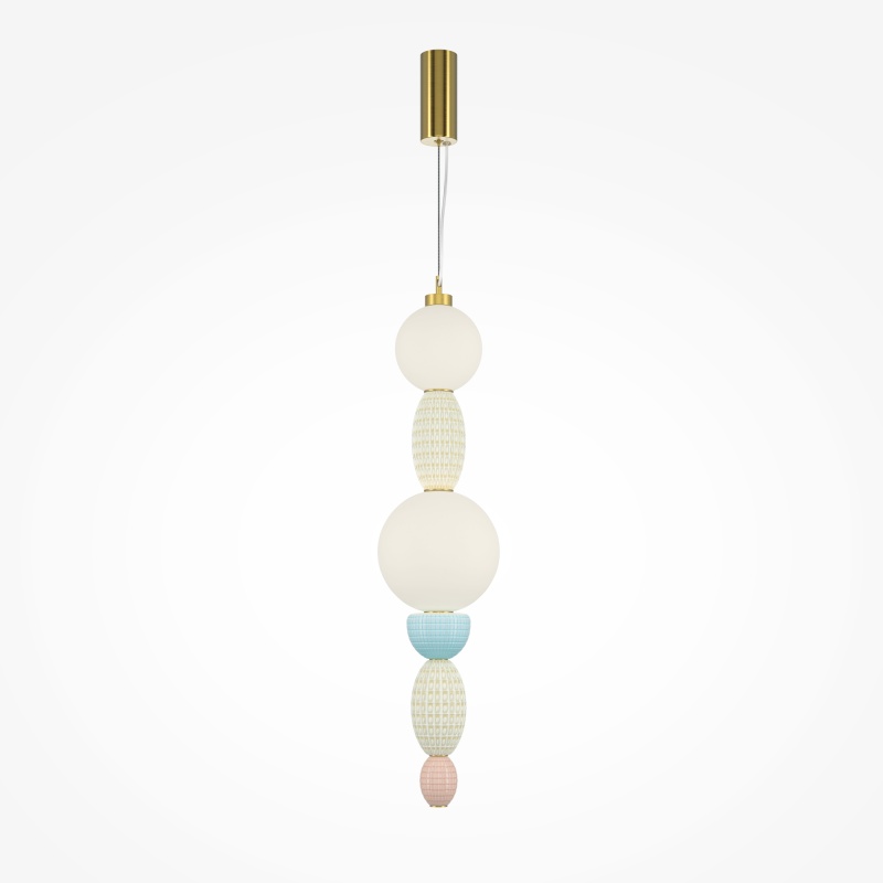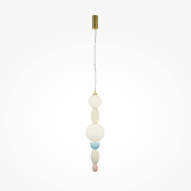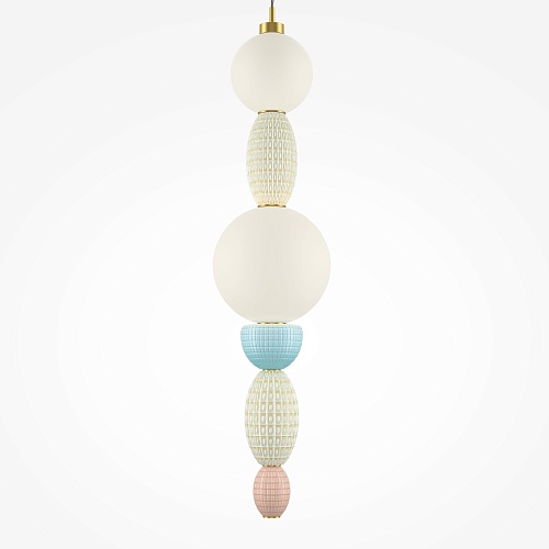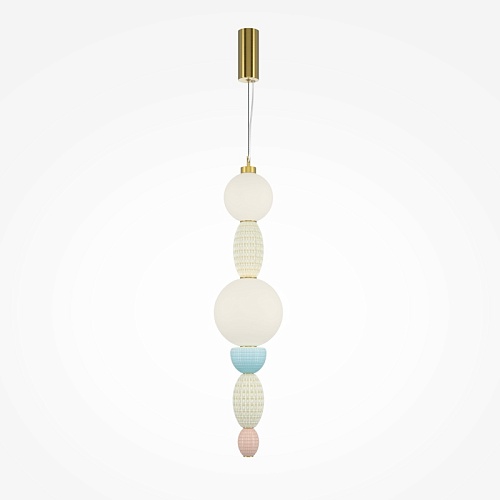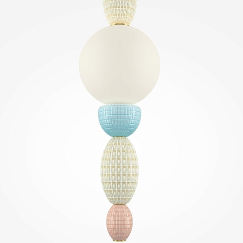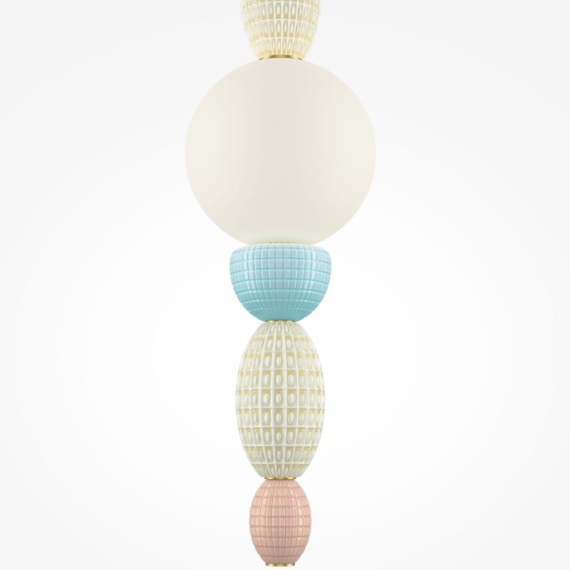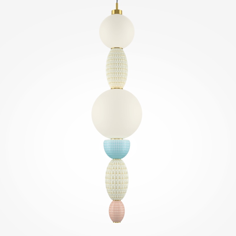 Металлическая арматура цвета латуни. Плафоны из белого стекла для мягкого, равномерного освещения, декоративные элементы из цветной керамики. Угол рассеивания 120°. Цветовая температура – 3000 К. Регулируемый провод длиной 3 м.