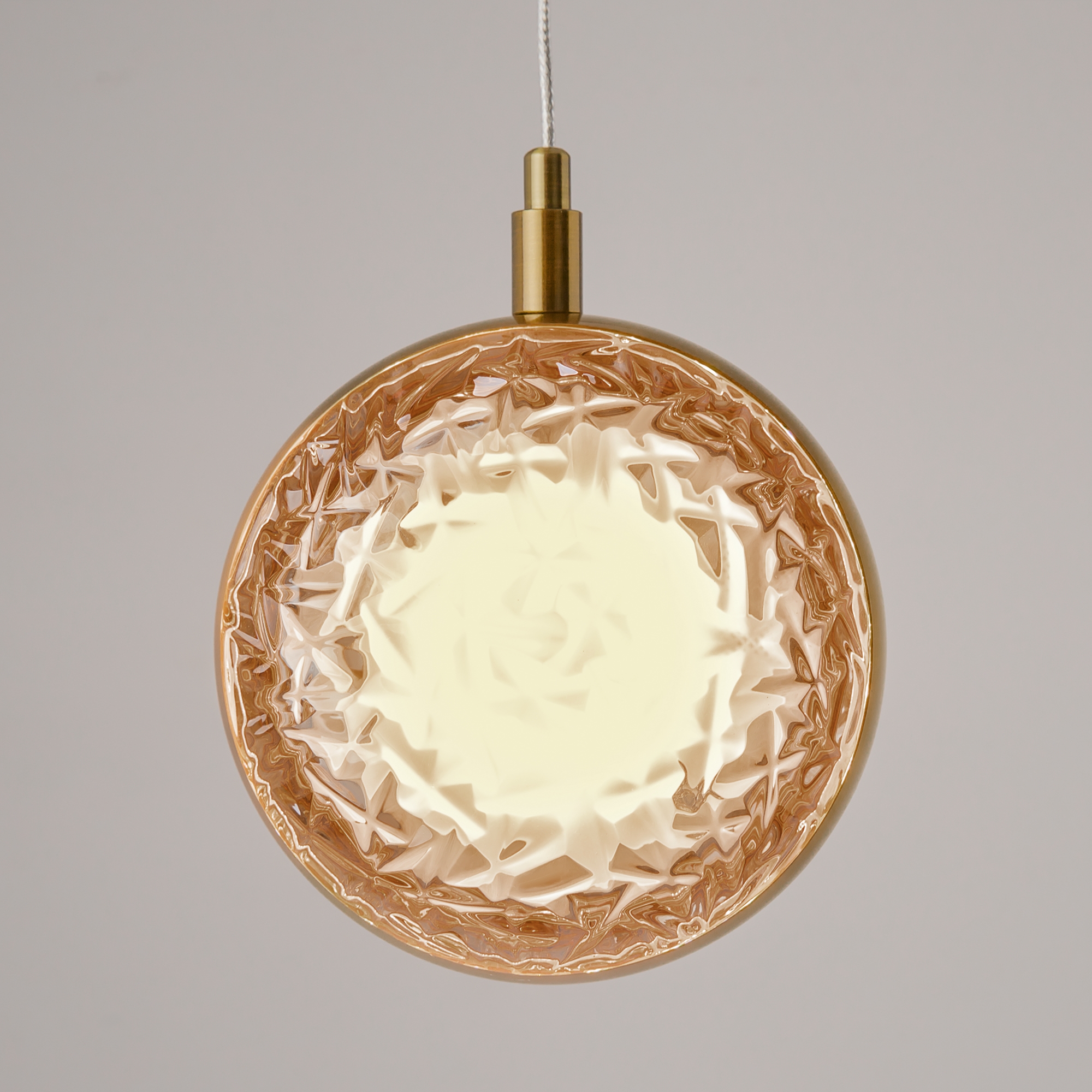 Два цветовых сочетания: сатинированная арматура из металла в цвете латунь в комбинации со стеклянными плафонами янтарного оттенка или трендовый черный хром с глянцевым финишем в сочетании с тонированными светло-серыми плафонами. Источник света: LED. Цветовая температура 3000К, угол рассеивания 120 градусов. Провод длиной 3 м можно регулировать по высоте — светильник подходит для помещений с высокими потолками.