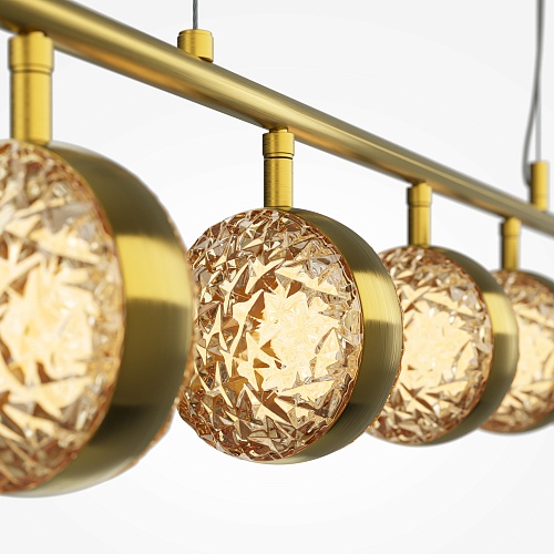 Два цветовых сочетания: сатинированная арматура из металла в цвете латунь в комбинации со стеклянными плафонами янтарного оттенка или трендовый черный хром с глянцевым финишем в сочетании с тонированными светло-серыми плафонами. Источник света: LED. Цветовая температура 3000К, угол рассеивания 120 градусов. Провод длиной 3 м можно регулировать по высоте — светильник подходит для помещений с высокими потолками.