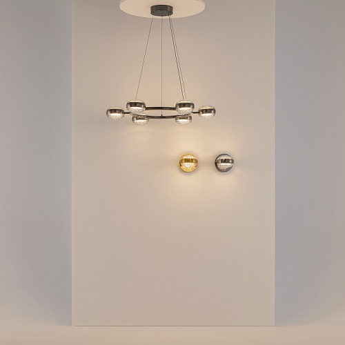 Два цветовых сочетания: сатинированная арматура из металла в цвете латунь в комбинации со стеклянными плафонами янтарного оттенка или трендовый черный хром с глянцевым финишем в сочетании с тонированными светло-серыми плафонами. Источник света: LED. Цветовая температура 3000К, угол рассеивания 120 градусов. Провод длиной 3 м можно регулировать по высоте — светильник подходит для помещений с высокими потолками.