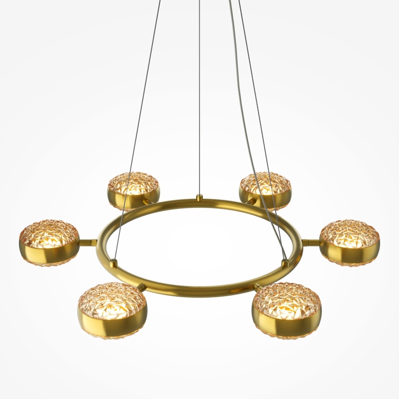 Два цветовых сочетания: сатинированная арматура из металла в цвете латунь в комбинации со стеклянными плафонами янтарного оттенка или трендовый черный хром с глянцевым финишем в сочетании с тонированными светло-серыми плафонами. Источник света: LED. Цветовая температура 3000К, угол рассеивания 120 градусов. Провод длиной 3 м можно регулировать по высоте — светильник подходит для помещений с высокими потолками.