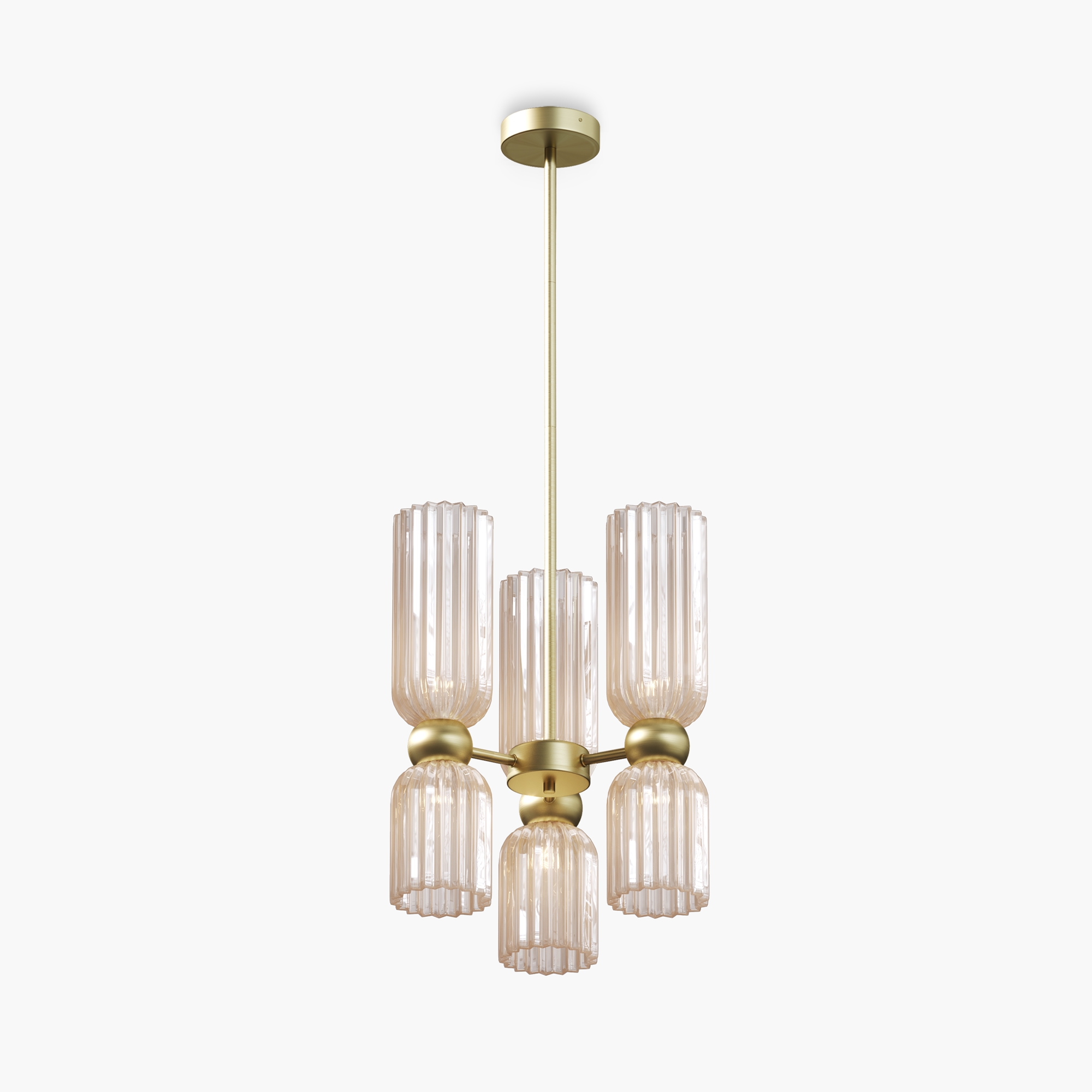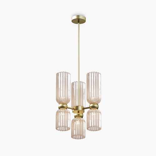 Металлическая арматура в цвете золота. Плафоны стеклянные нескольких цветов: коньячный, дымчатый, белый, серый. Источник света: цоколь Е14. Высота регулируется сегментами штанги или с помощью трехметрового провода. Серия применима в помещениях с высокими потолками. Поверхность стеклянных плафонов рифленая, усиливающая световые эффекты.