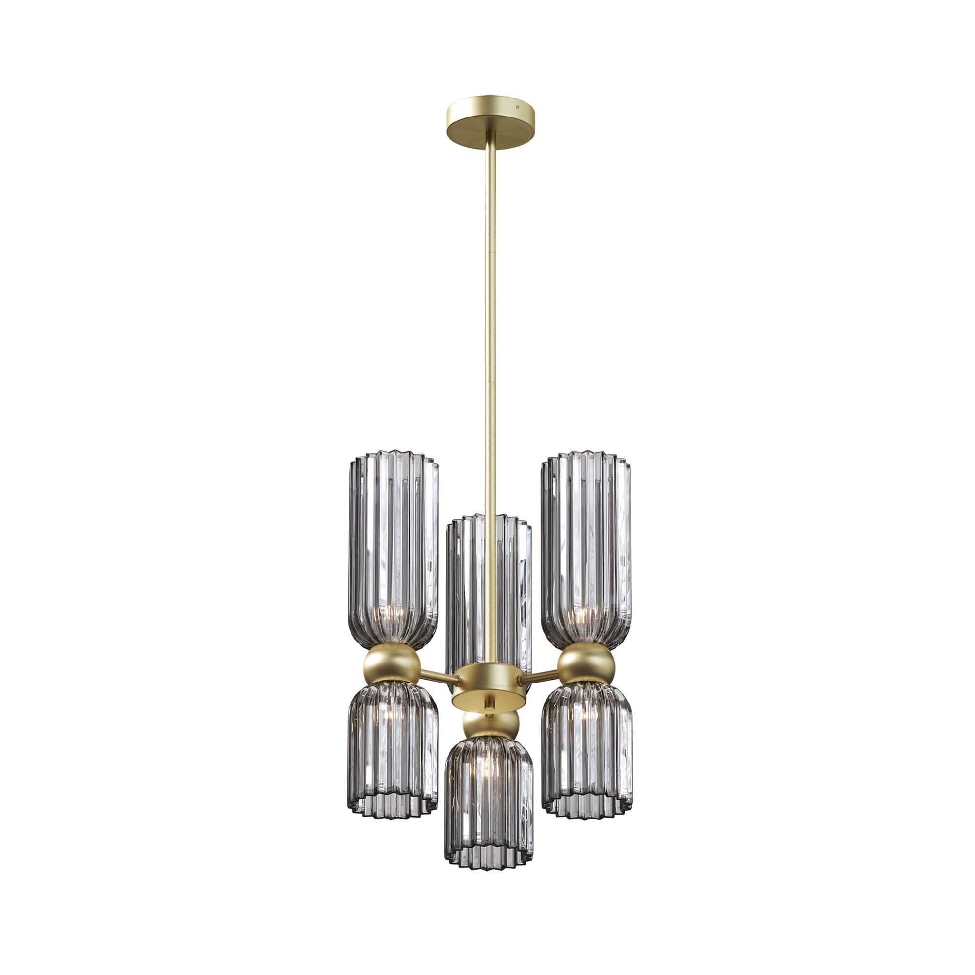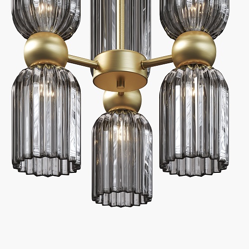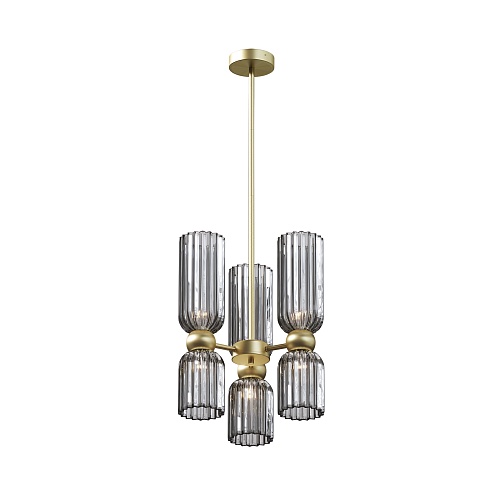 Металлическая арматура в цвете золота. Плафоны стеклянные нескольких цветов: коньячный, дымчатый, белый, серый. Источник света: цоколь Е14. Высота регулируется сегментами штанги или с помощью трехметрового провода. Серия применима в помещениях с высокими потолками. Поверхность стеклянных плафонов рифленая, усиливающая световые эффекты.