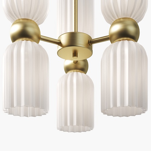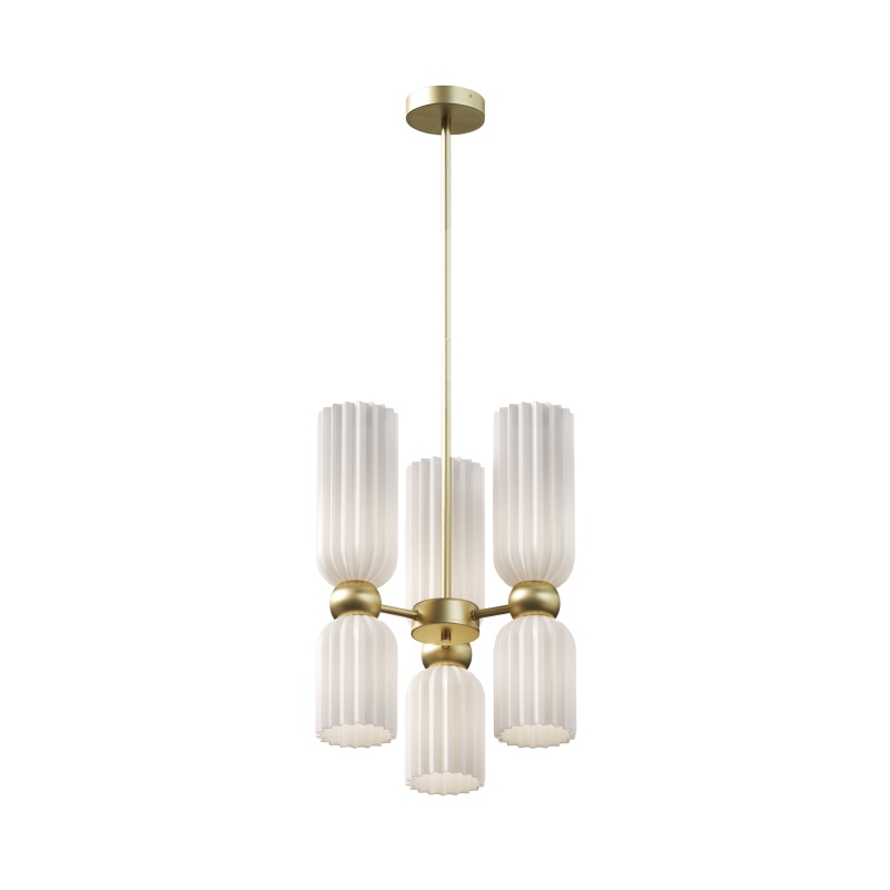 Металлическая арматура в цвете золота. Плафоны стеклянные нескольких цветов: коньячный, дымчатый, белый, серый. Источник света: цоколь Е14. Высота регулируется сегментами штанги или с помощью трехметрового провода. Серия применима в помещениях с высокими потолками. Поверхность стеклянных плафонов рифленая, усиливающая световые эффекты.
