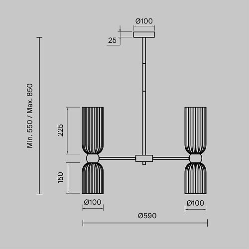 Металлическая арматура в цвете золота. Плафоны стеклянные нескольких цветов: коньячный, дымчатый, белый, серый. Источник света: цоколь Е14. Высота регулируется сегментами штанги или с помощью трехметрового провода. Серия применима в помещениях с высокими потолками. Поверхность стеклянных плафонов рифленая, усиливающая световые эффекты.