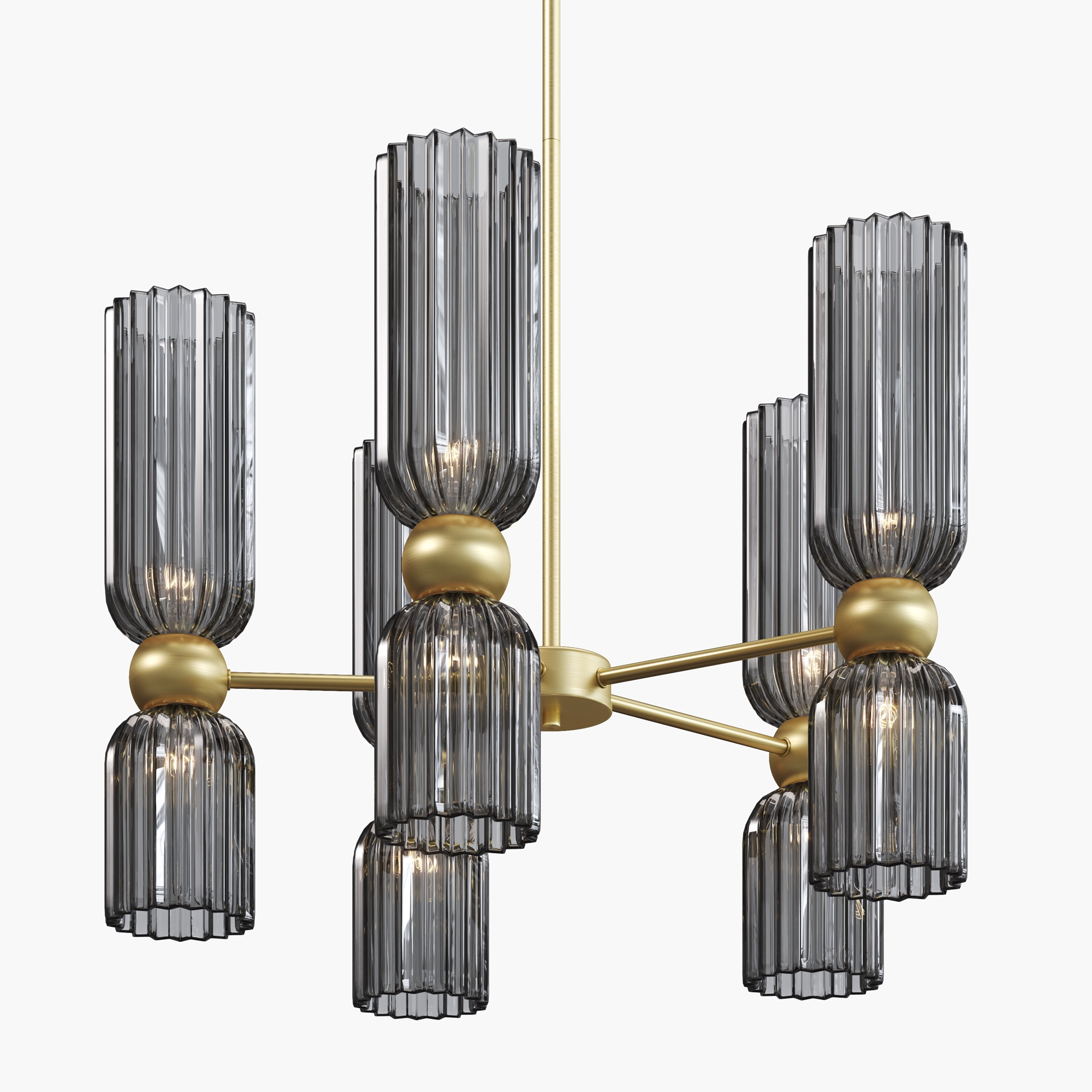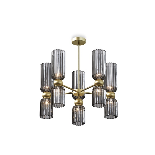 Металлическая арматура в цвете золота. Плафоны стеклянные нескольких цветов: коньячный, дымчатый, белый, серый. Источник света: цоколь Е14. Высота регулируется сегментами штанги или с помощью трехметрового провода. Серия применима в помещениях с высокими потолками. Поверхность стеклянных плафонов рифленая, усиливающая световые эффекты.