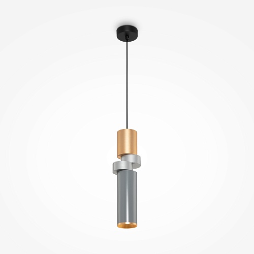 Металлическая арматура сочетает серый, золотой и серебряный цвет. Комбина ция цилиндрических форм в дизайне. Высота регулируется с помощью кабеля. Цоколь GU10
