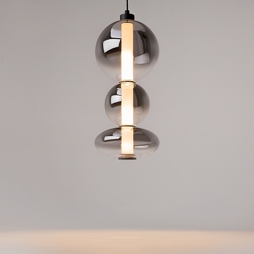 Светильники с тонированными выдувными стеклянными плафонами (дымчатыми или янтарными) и металлической арматурой (черной или цвета латуни). Окрашивание плафонов градиентное. Источник света: LED. Световой элемент установлен внутри акрилового рассеивателя. Цветовая температура источника света – 3000К, угол рассеивания — 120°. Торшеры снабжены Push-кнопкой на проводе.