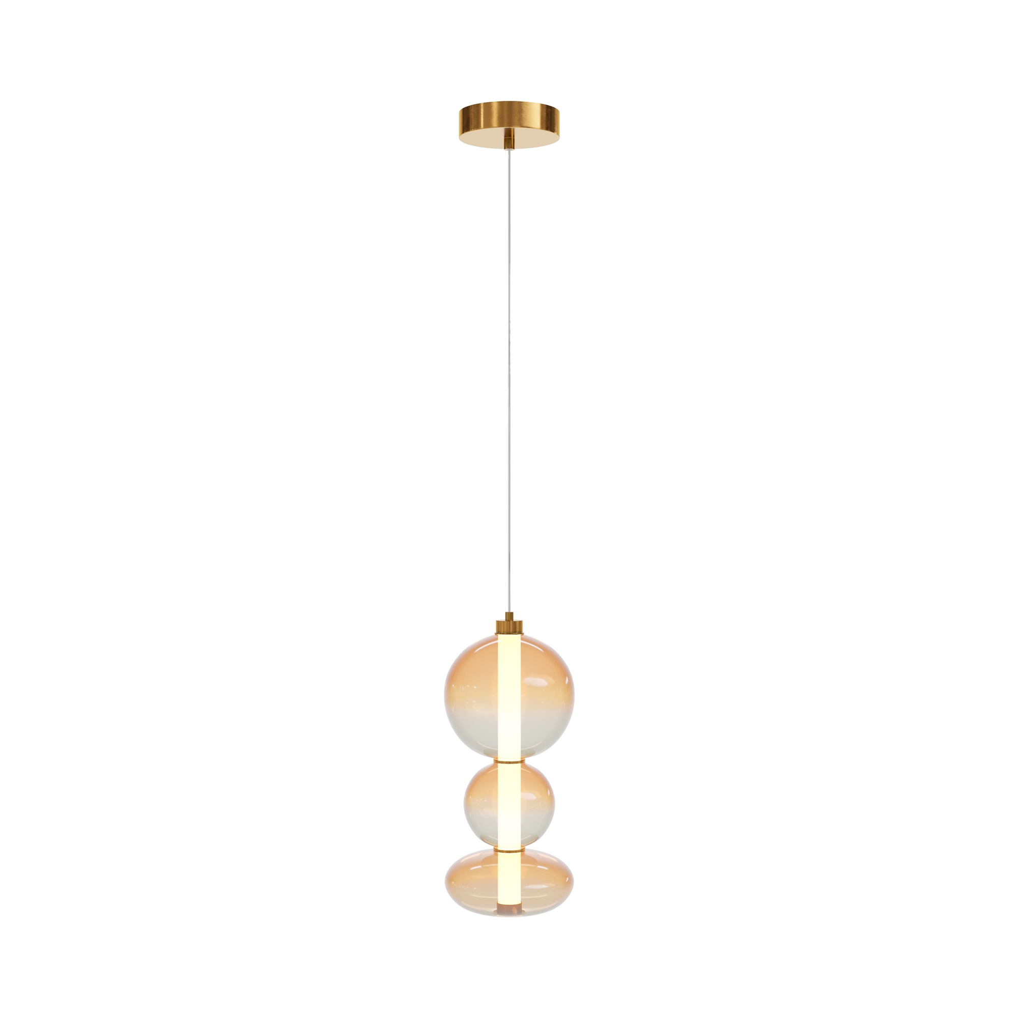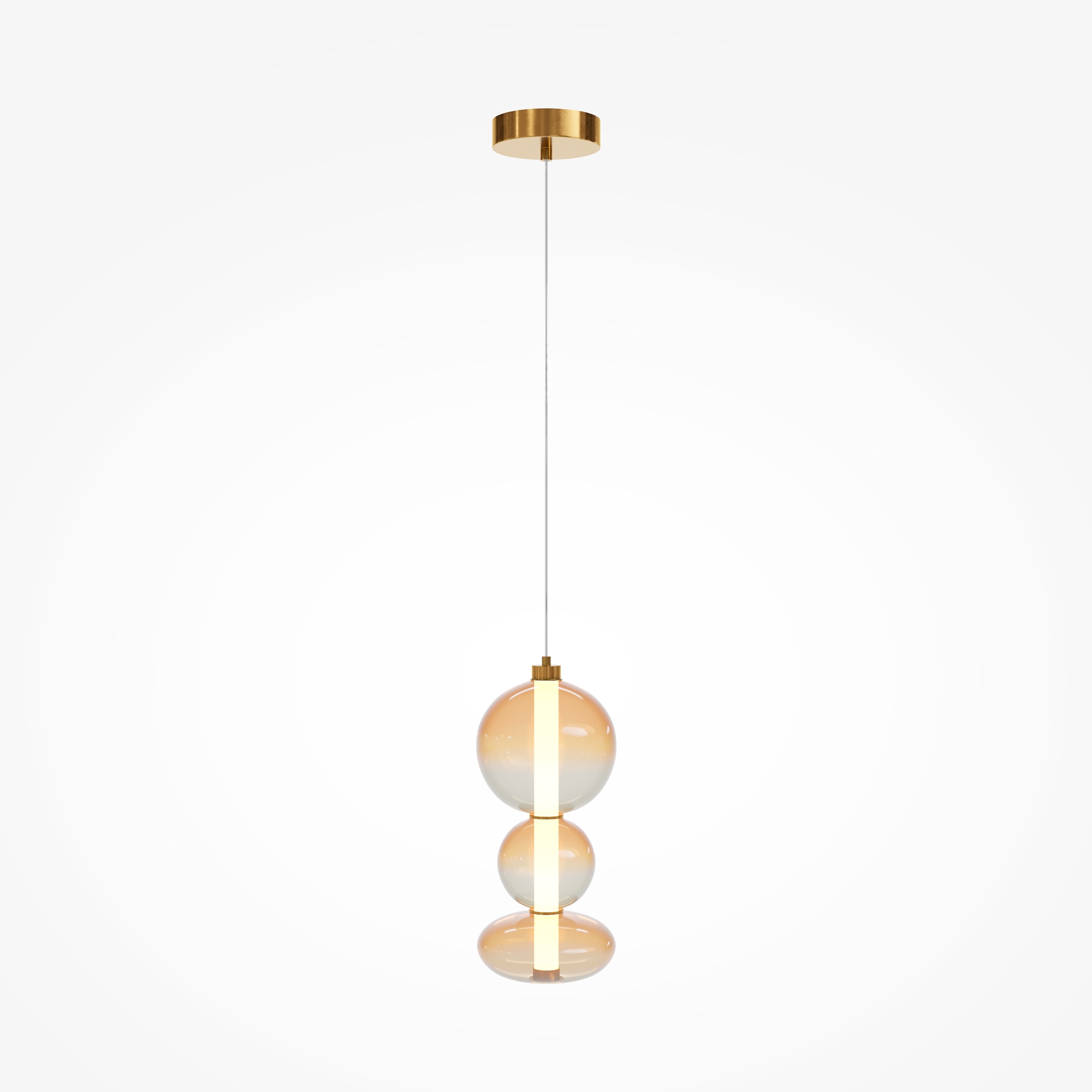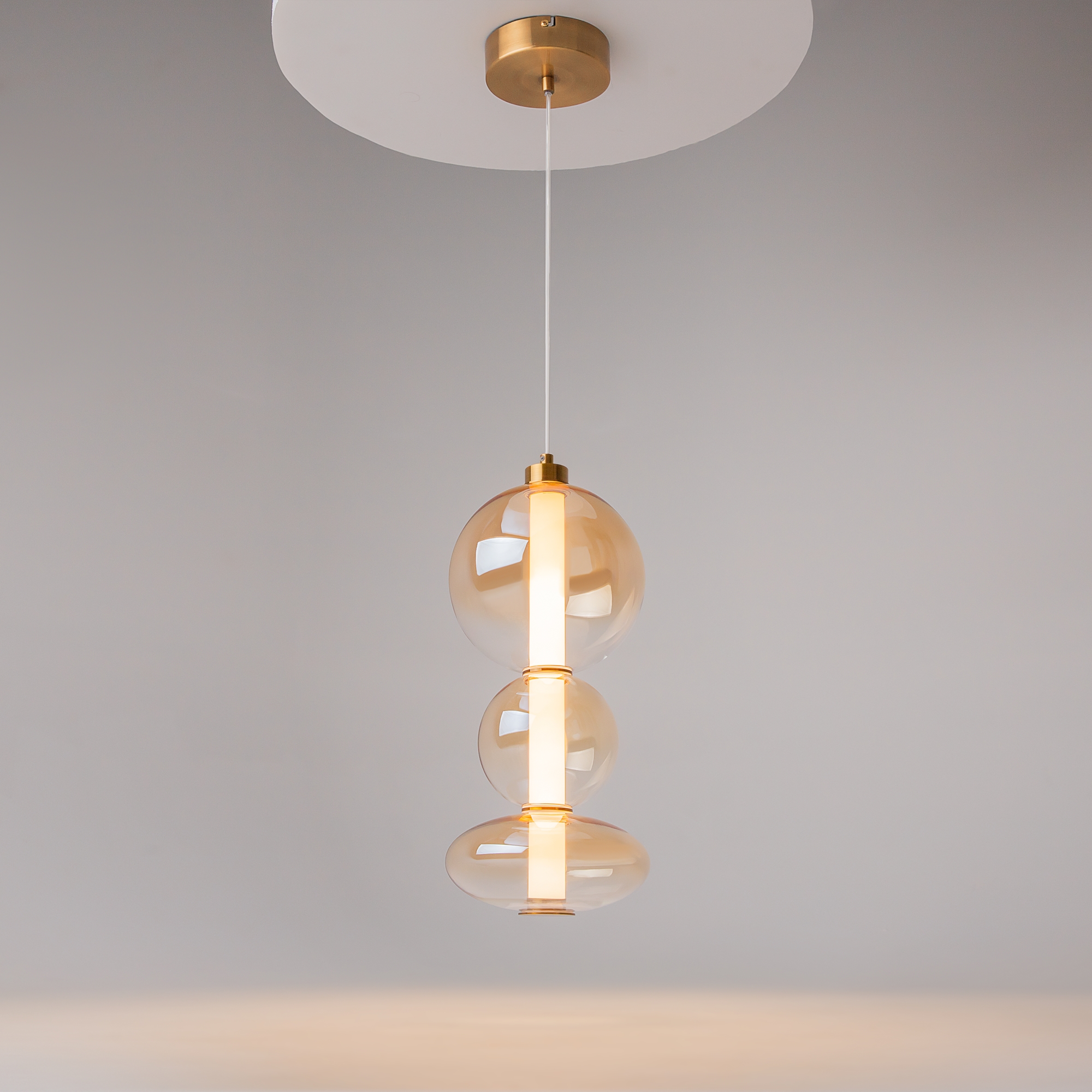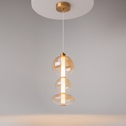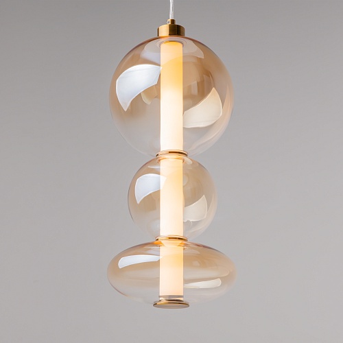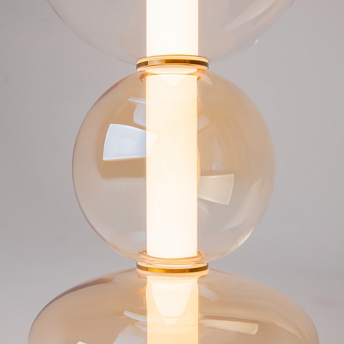 Светильники с тонированными выдувными стеклянными плафонами (дымчатыми или янтарными) и металлической арматурой (черной или цвета латуни). Окрашивание плафонов градиентное. Источник света: LED. Световой элемент установлен внутри акрилового рассеивателя. Цветовая температура источника света – 3000К, угол рассеивания — 120°. Торшеры снабжены Push-кнопкой на проводе.
