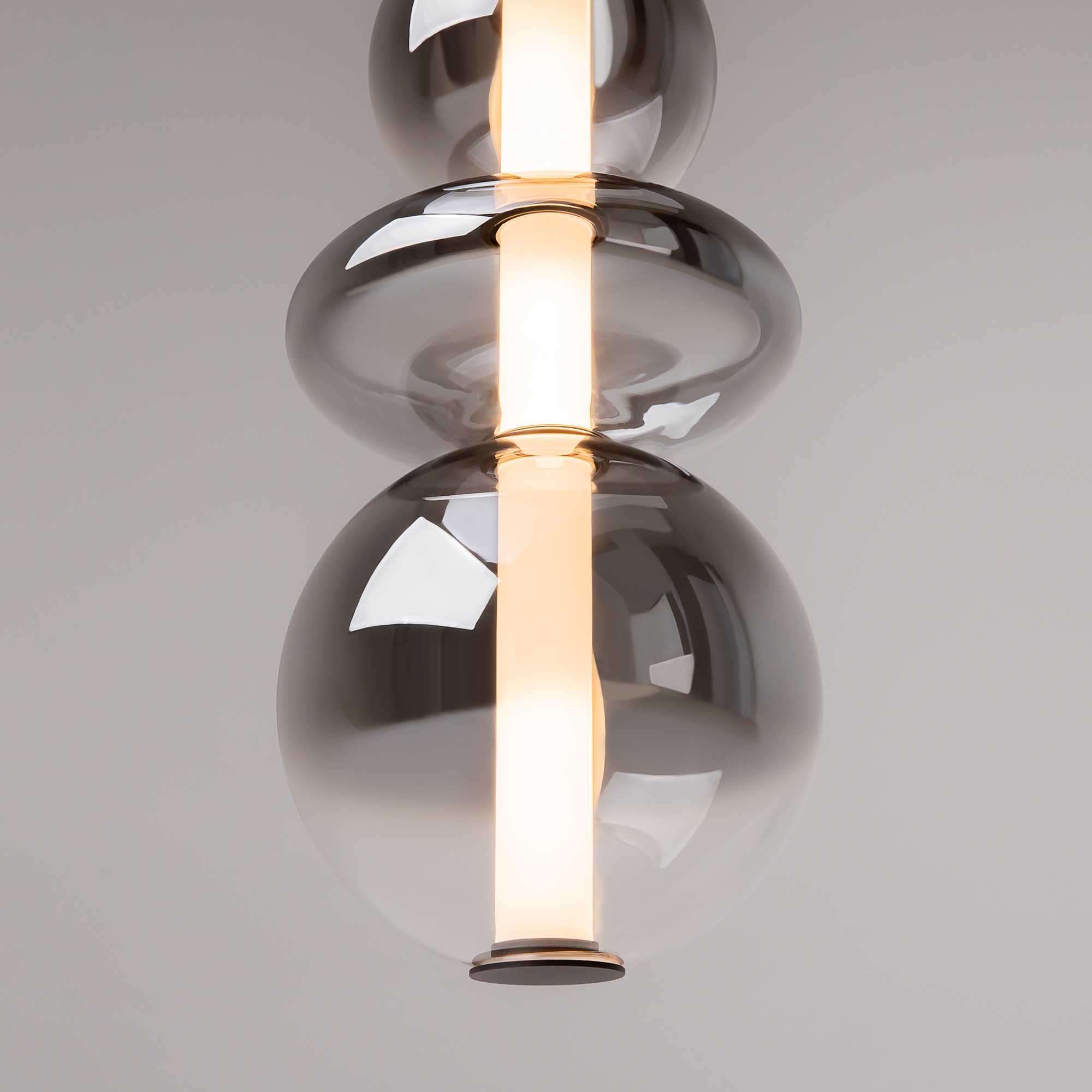Светильники с тонированными выдувными стеклянными плафонами (дымчатыми или янтарными) и металлической арматурой (черной или цвета латуни). Окрашивание плафонов градиентное. Источник света: LED. Световой элемент установлен внутри акрилового рассеивателя. Цветовая температура источника света – 3000К, угол рассеивания — 120°. Торшеры снабжены Push-кнопкой на проводе.