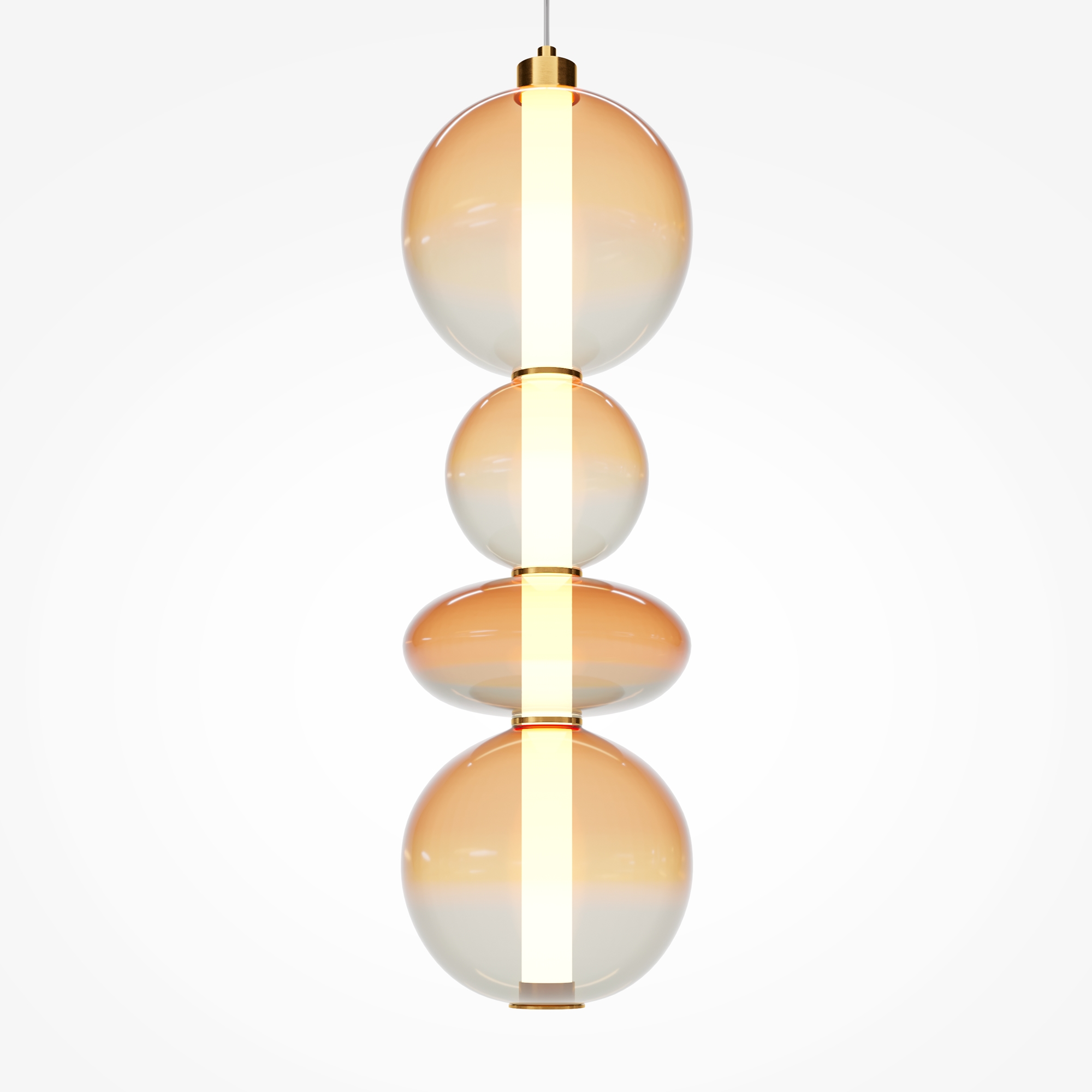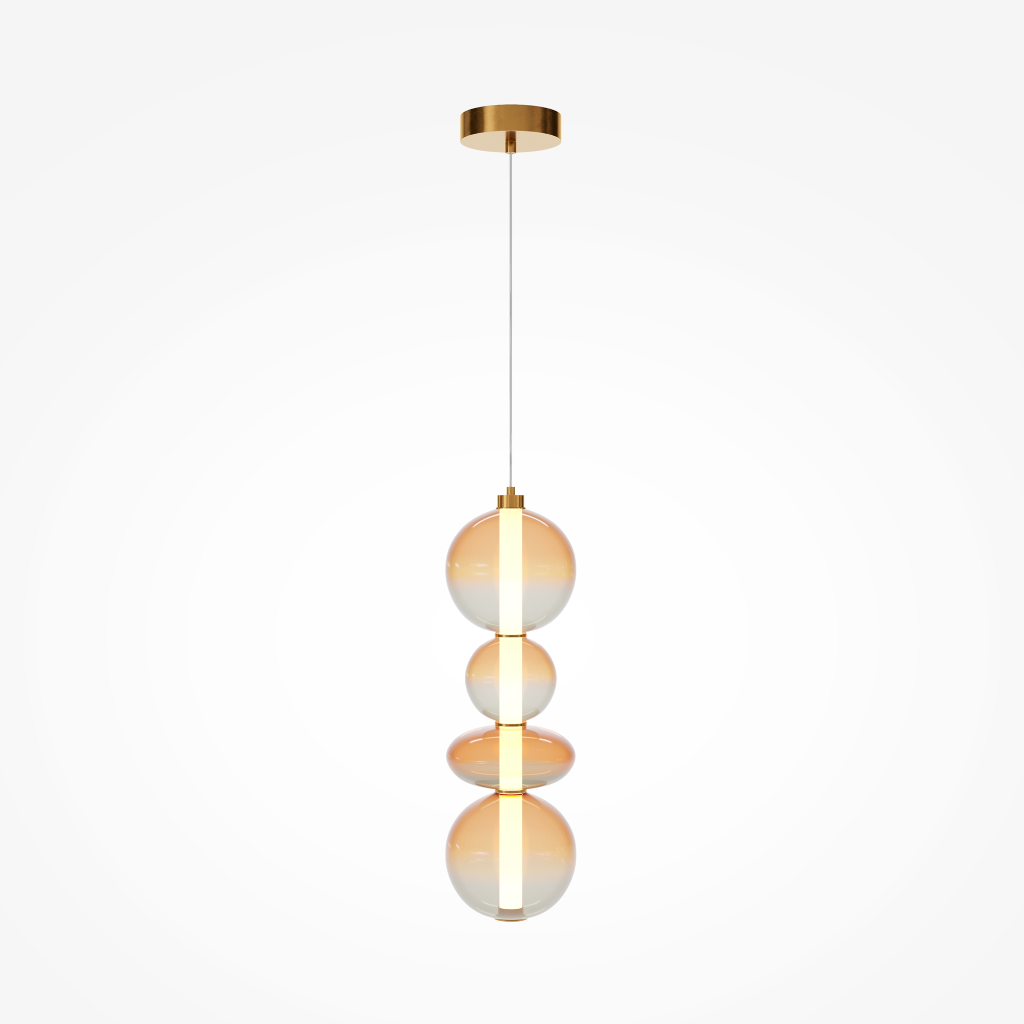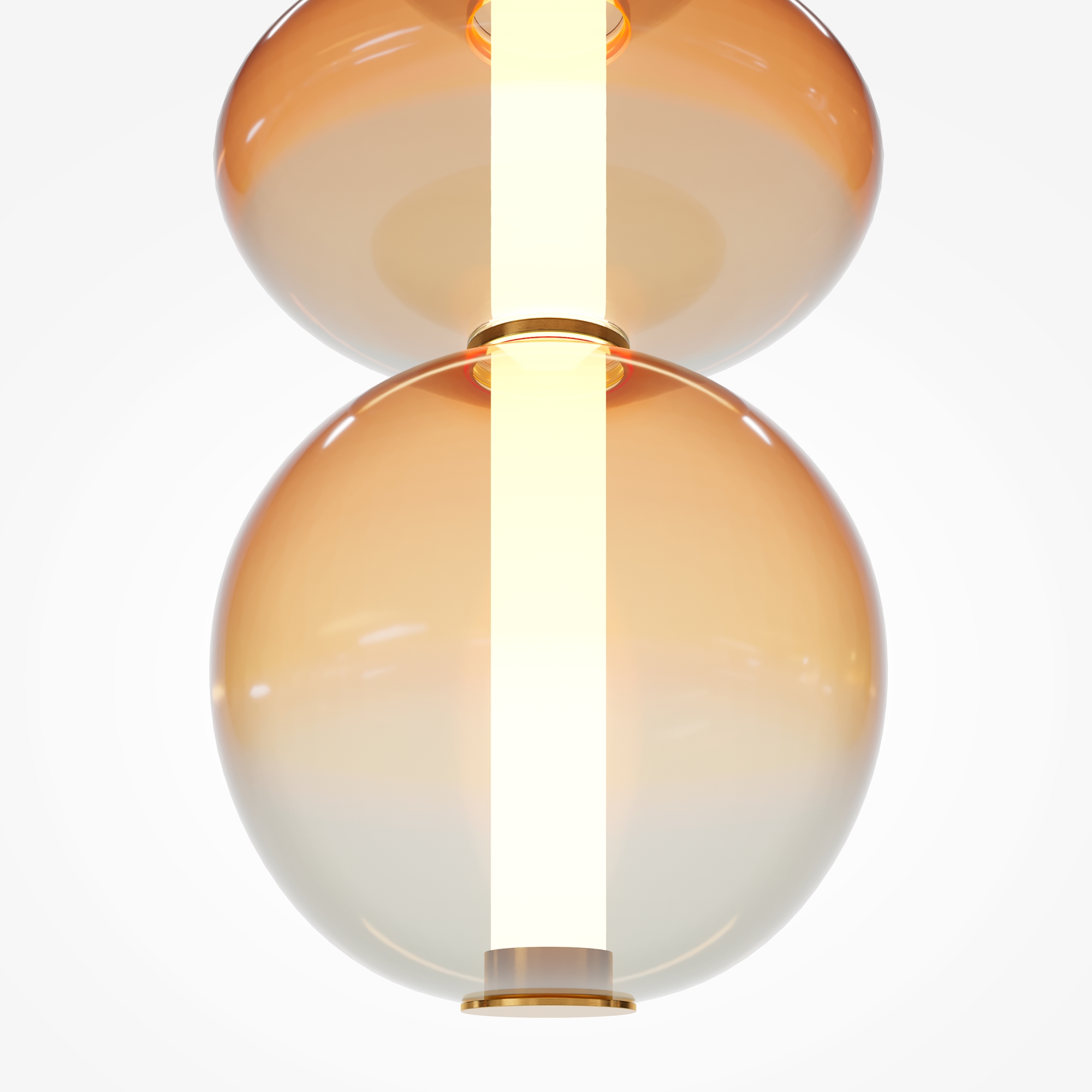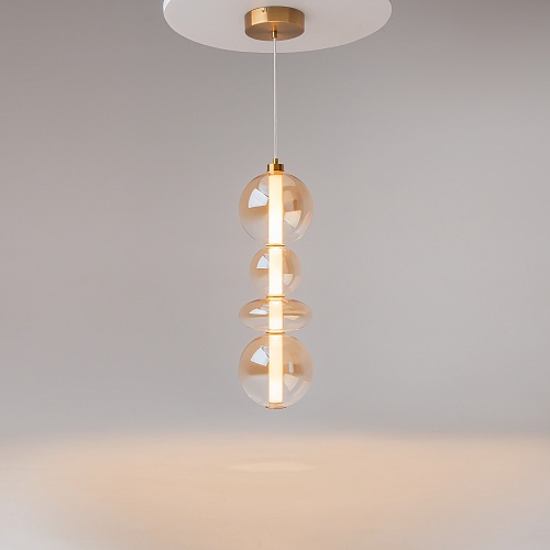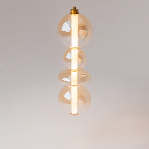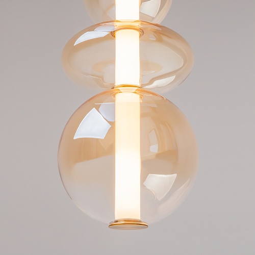 Светильники с тонированными выдувными стеклянными плафонами (дымчатыми или янтарными) и металлической арматурой (черной или цвета латуни). Окрашивание плафонов градиентное. Источник света: LED. Световой элемент установлен внутри акрилового рассеивателя. Цветовая температура источника света – 3000К, угол рассеивания — 120°. Торшеры снабжены Push-кнопкой на проводе.