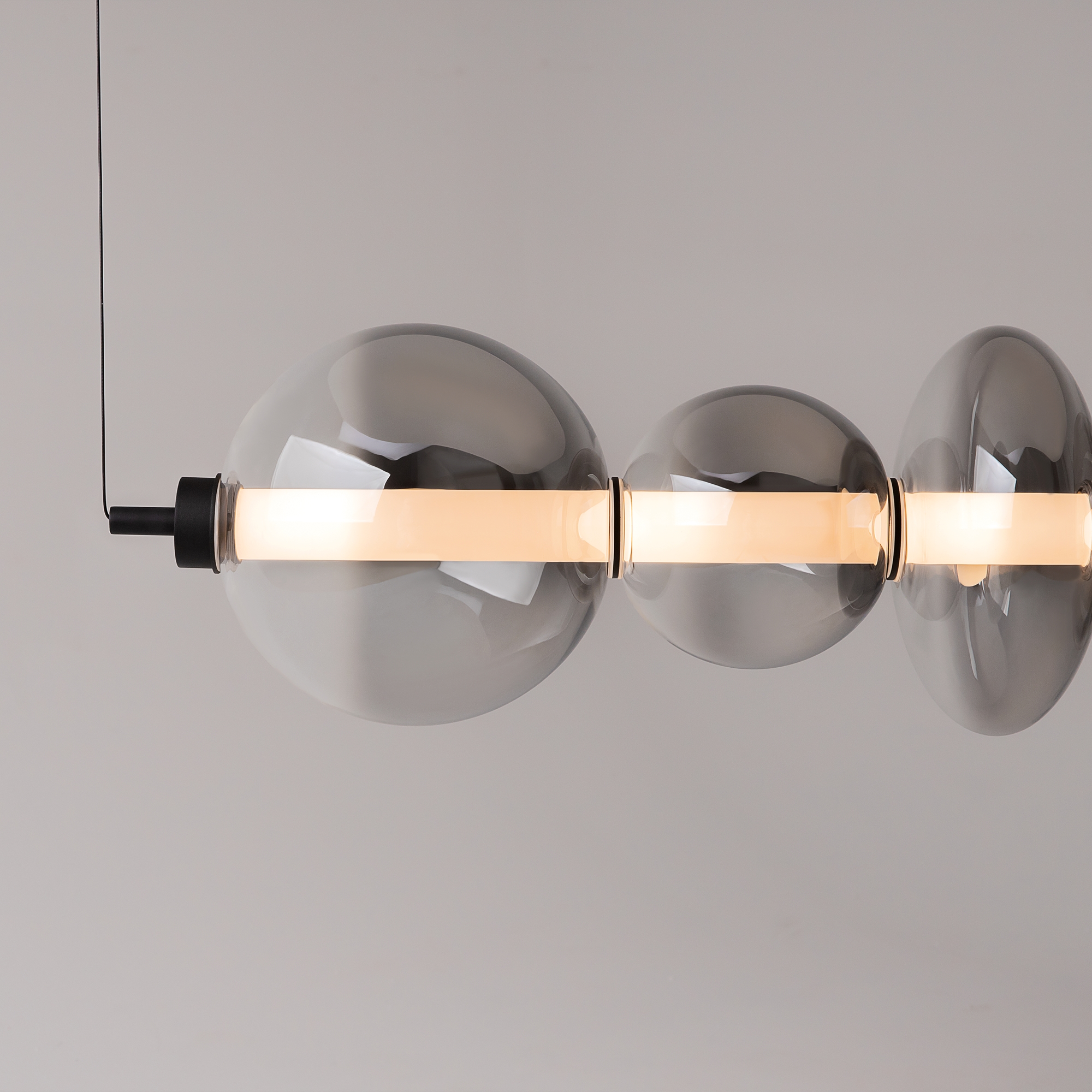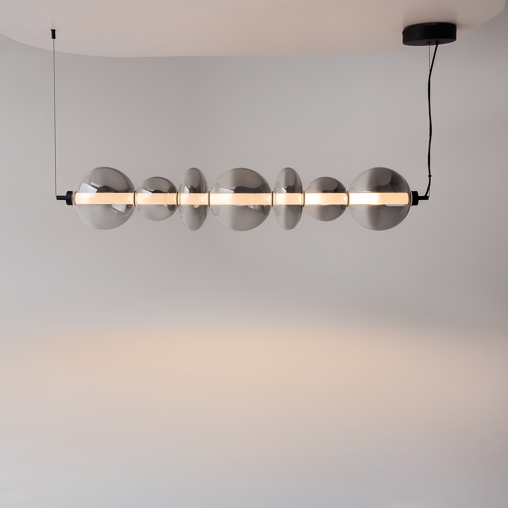 Светильники с тонированными выдувными стеклянными плафонами (дымчатыми или янтарными) и металлической арматурой (черной или цвета латуни). Окрашивание плафонов градиентное. Источник света: LED. Световой элемент установлен внутри акрилового рассеивателя. Цветовая температура источника света – 3000К, угол рассеивания — 120°. Торшеры снабжены Push-кнопкой на проводе.
