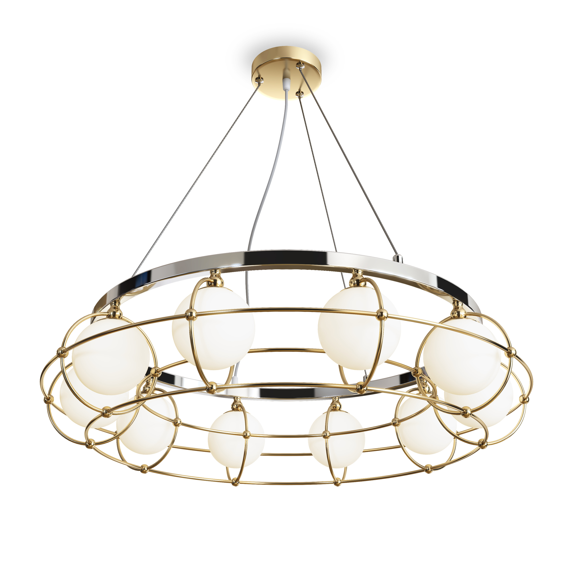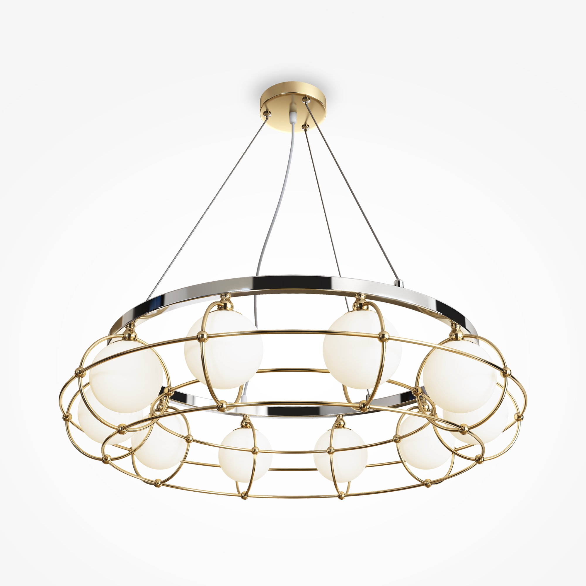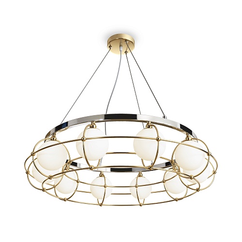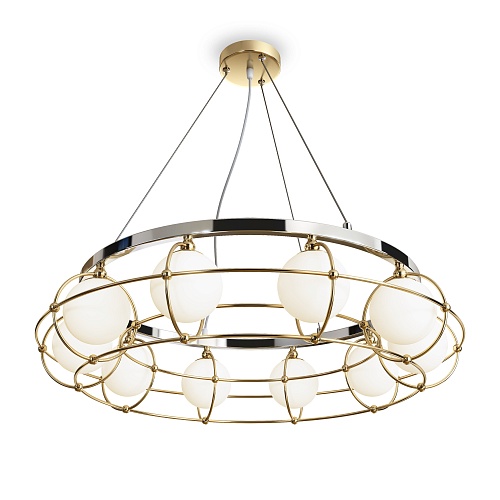 Металлическая арматура сочетает два цвета: хром и золото. Плафоны из белого выдувного стекла. Каждый световой элемент заключен в металлический каркас. Регулируемая высота. Цоколь G9.
