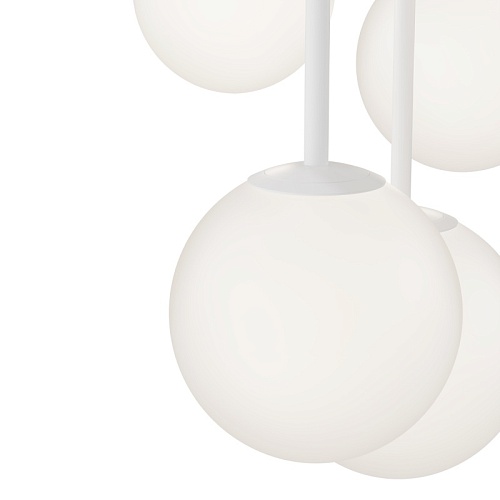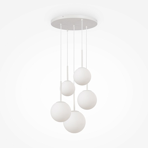 Материал арматуры – металл, цвет - золото, белый, черный. Округлые плафоны из матового белого стекла. Универсальные формы, минималистичный дизайн. Цоколь - E14. Лампы не входят в комплект. Регулируемая высота подвесных светильников.