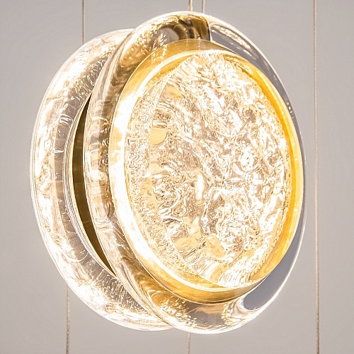 Арматура из металла цвета латунь с сатинированным финишным покрытием сочетается с прозрачными плафонами. Подвесные одинарные, горизонтальный и каскадные светильники оснащаются LED-модулем с двумя плоскими плафонами из акрила со сложным, актуальным паттерном на поверхности. Цветовая температура — 3000К, угол рассеивания — 125 градусов.