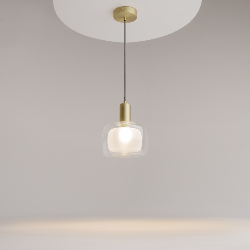 Арматура – алюминий, цвет – золото. Двойной стеклянный плафон: внутренний – матовый, внешний – прозрачный. Стиль – итальянская неоклассика. Культовые формы 60-х в дизайне.