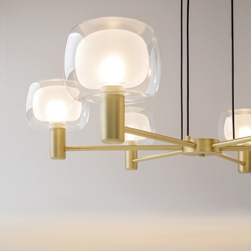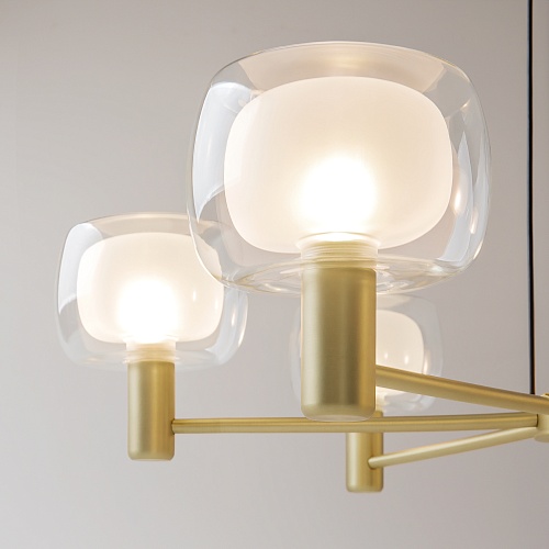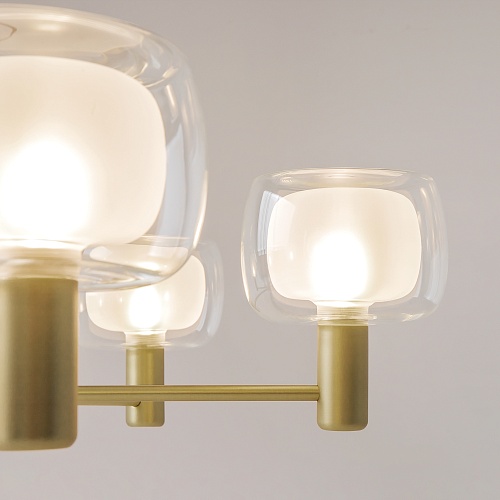 Арматура – алюминий, цвет – золото. Двойной стеклянный плафон: внутренний – матовый, внешний – прозрачный. Стиль – итальянская неоклассика. Культовые формы 60-х в дизайне.