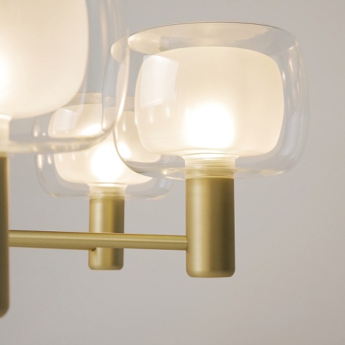 Арматура – алюминий, цвет – золото. Двойной стеклянный плафон: внутренний – матовый, внешний – прозрачный. Стиль – итальянская неоклассика. Культовые формы 60-х в дизайне.