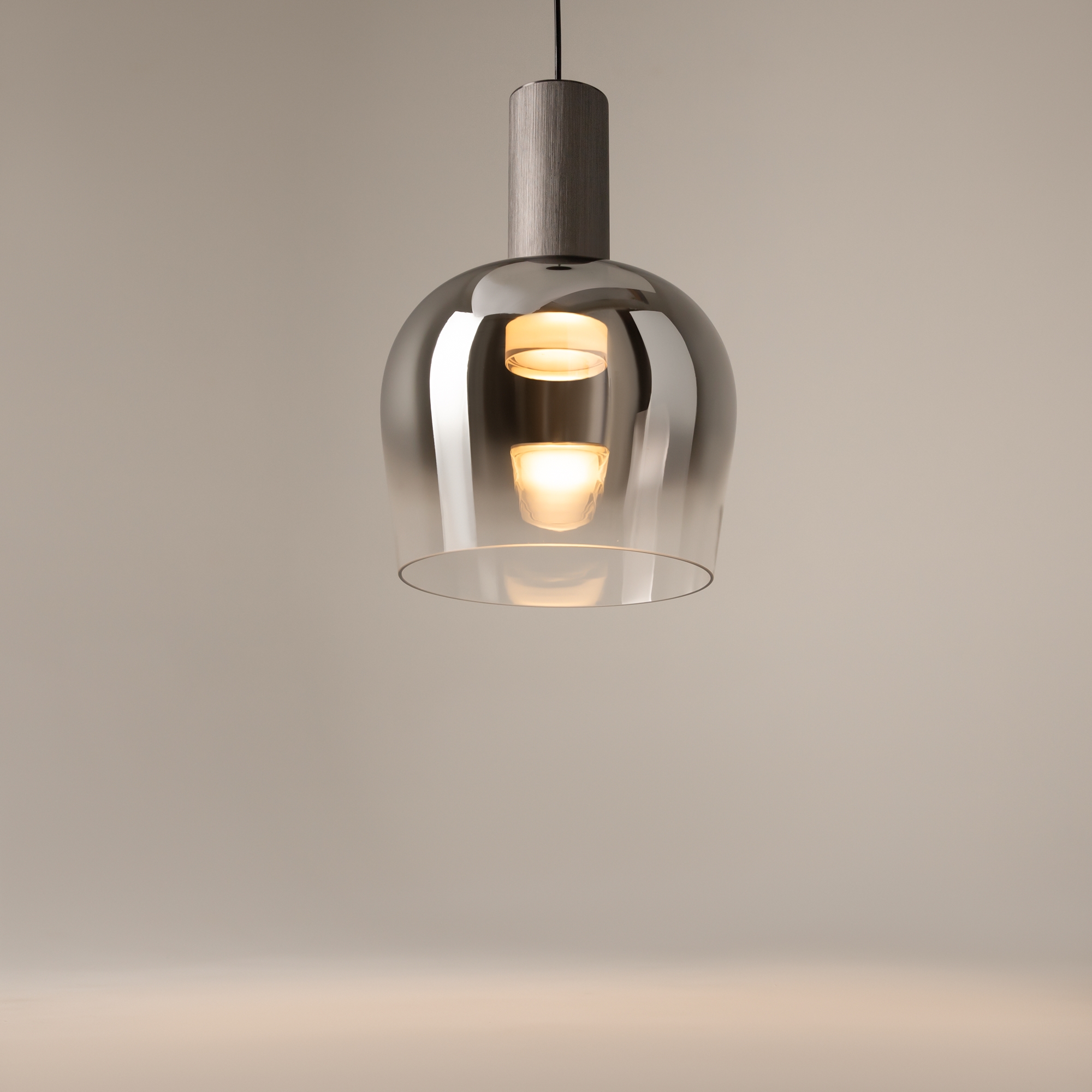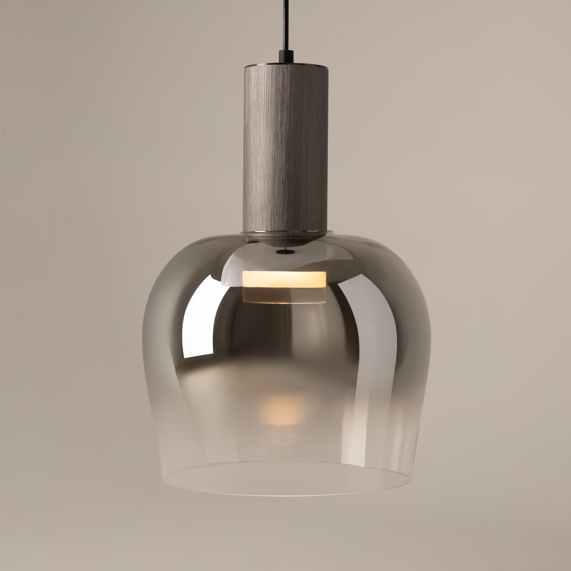 Цветовая гамма: дымчато-серый или насыщенно-янтарный цвет стекла в сочетании с черной или золотой арматурой. В серии есть модели светильников со сменным источником света с цоколем Е27 (каскадная композиция, потолочный и настольные светильники) и LED-источником (одинарные подвесные светильники). Температура свечения LED – 3000 К, угол рассеивания — 120 градусов. Плафоны каскадной композиции плафоны разных размеров и оттенков, установленные на одно основание. Оригинальный декор — актуальный вариант современной классики.