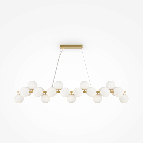 Металлическая арматура в четырех цветах: матовый черный, хром, золото, латунь. Плафоны — выдувное стекло. Цвета — дымчатый, янтарный, коньячный. Дизайн с имитацией молекулярной структуры. Высота подвесных светильников регулируется тросом. Лампа с цоколем G9.