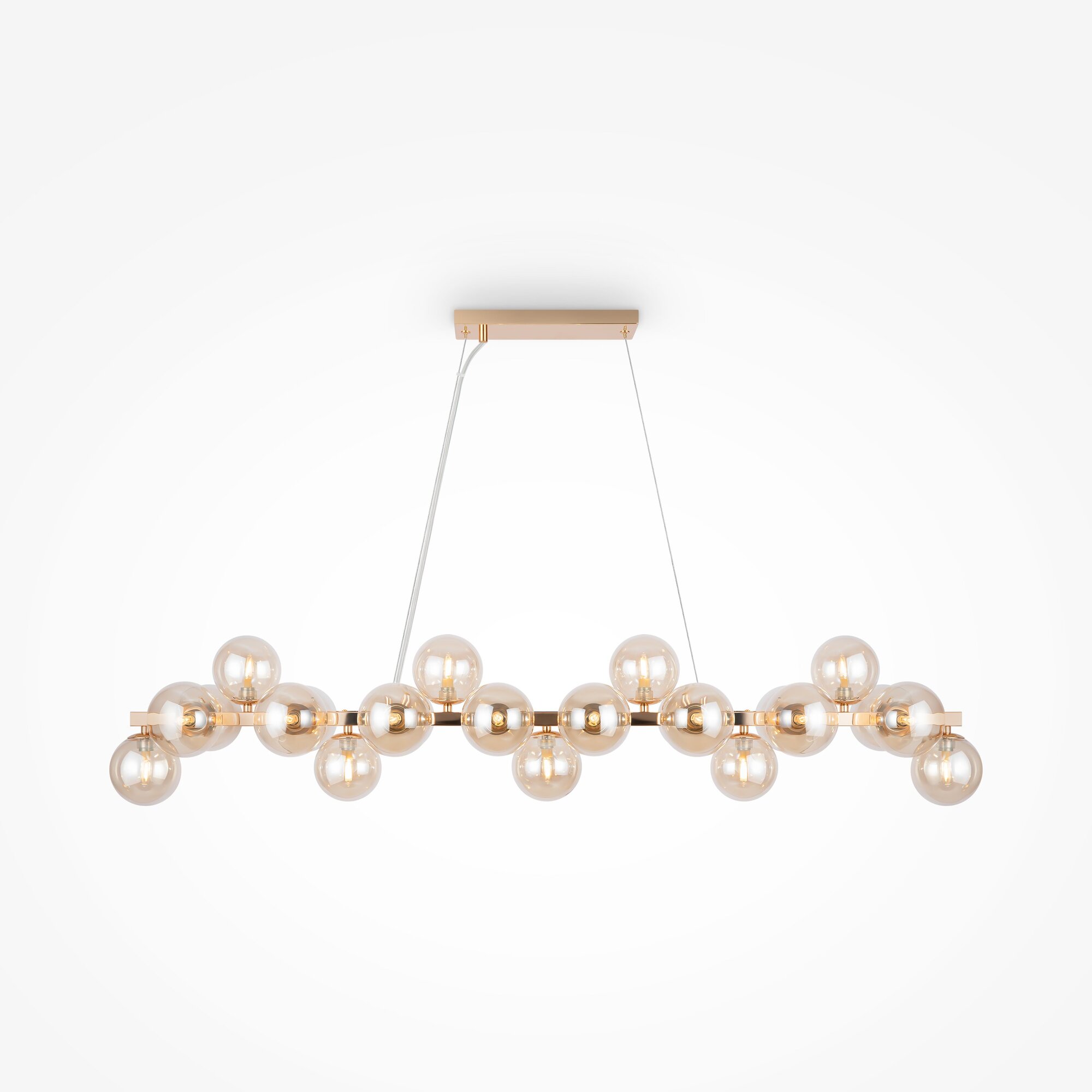 Металлическая арматура в четырех цветах: матовый черный, хром, золото, латунь. Плафоны — выдувное стекло. Цвета — дымчатый, янтарный, коньячный. Дизайн с имитацией молекулярной структуры. Высота подвесных светильников регулируется тросом. Лампа с цоколем G9.
