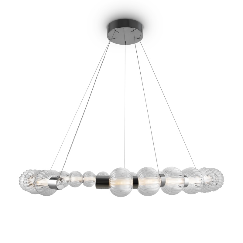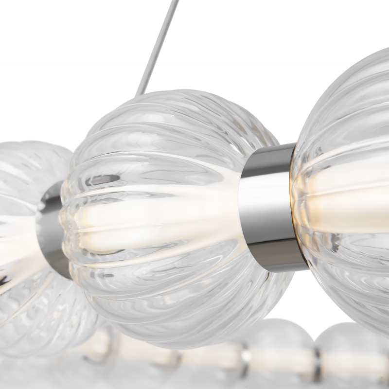 Арматура из металла, цвет – хром. Акцентный декор в виде рельефных сфер из литого стекла. Источник света – светодиодная лента – скрыта под акриловым рассеивателем. Регулируемая высота подвесных светильников.