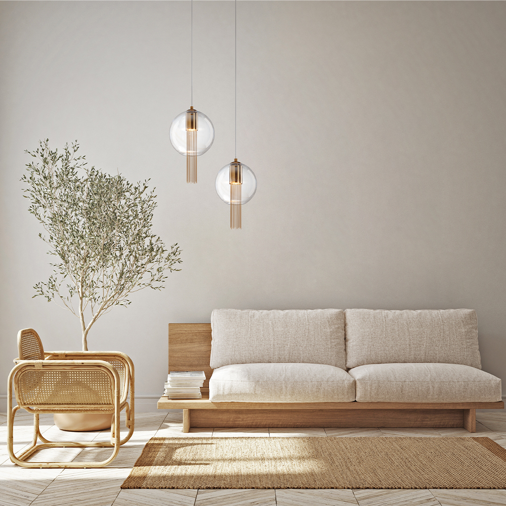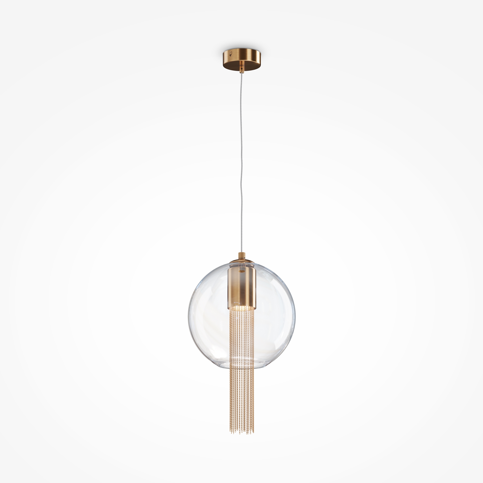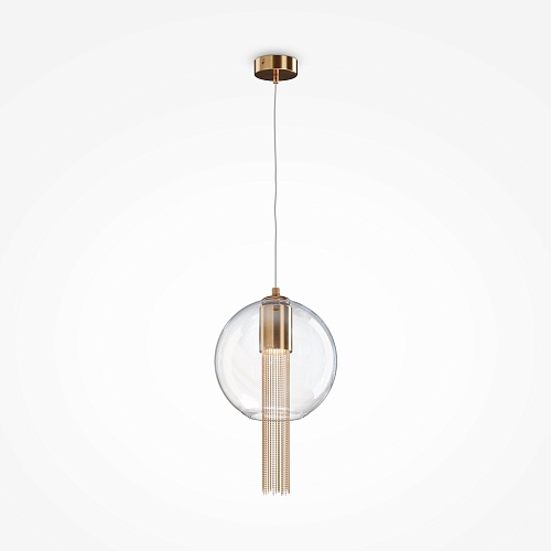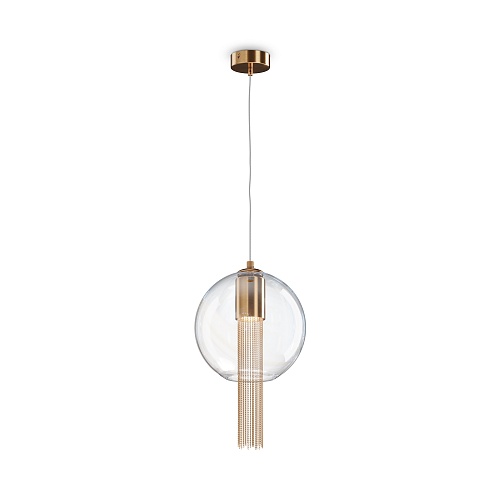 Металлическая арматура в бронзовом оттенке. Плафон-сфера – прозрачное выдувное стекло. Декор – подвесные цепочки внутри плафона. Скрытый источник света.