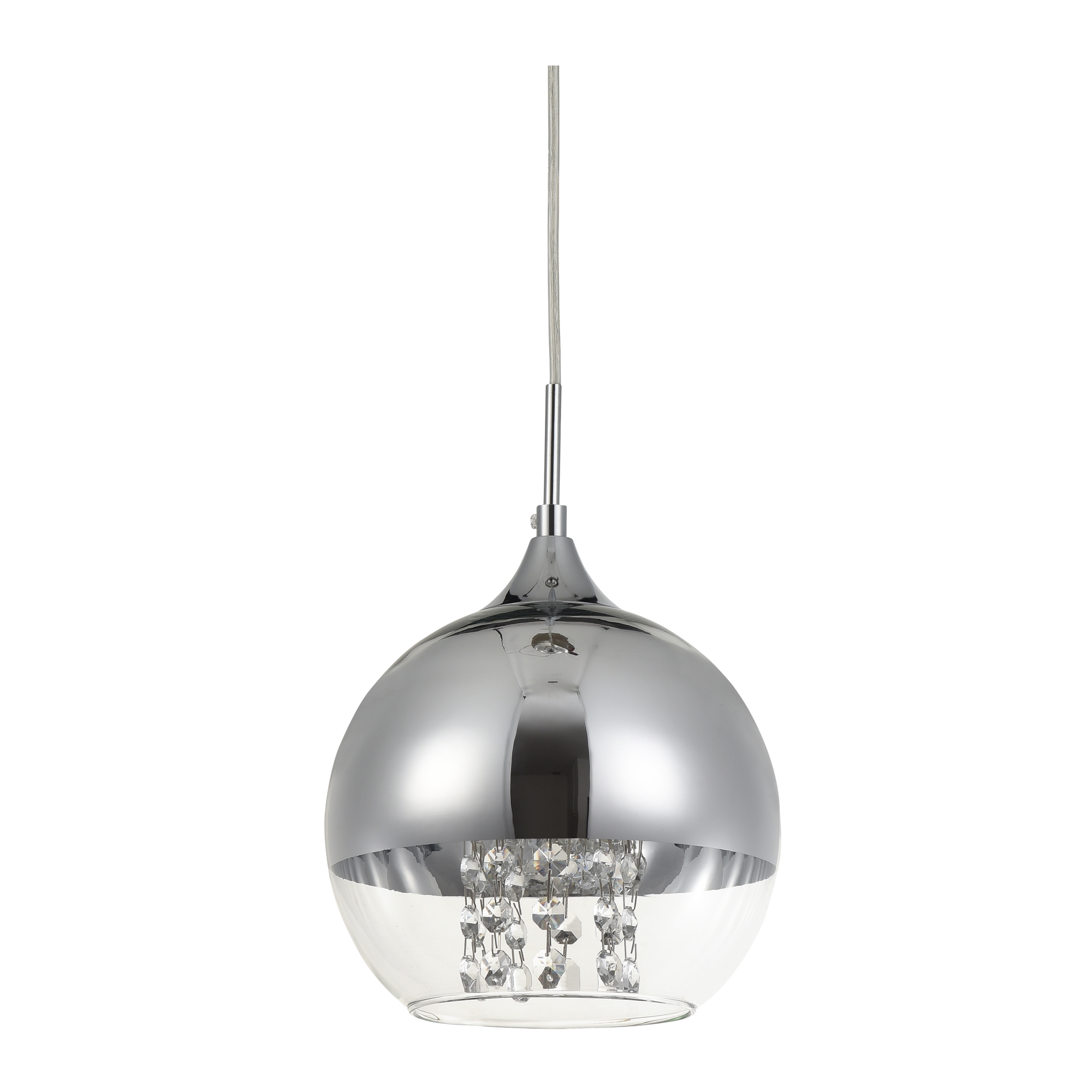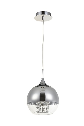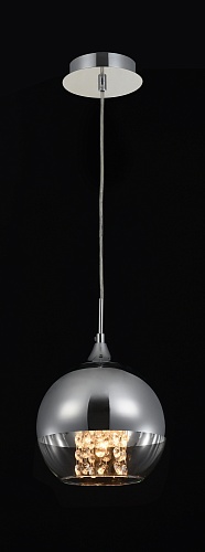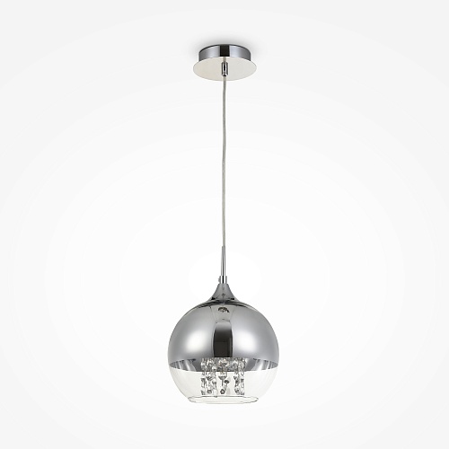 Арматура из металла в двух оттенках: никель и золото. Часть плафона выполнена из металла в тон арматуре, другая часть — из прозрачного стекла. Декоративные подвески внутри плафонов. Регулируемая высота.
