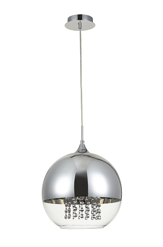 Арматура из металла в двух оттенках: никель и золото. Часть плафона выполнена из металла в тон арматуре, другая часть — из прозрачного стекла. Декоративные подвески внутри плафонов. Регулируемая высота.