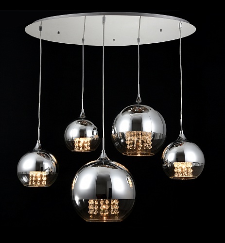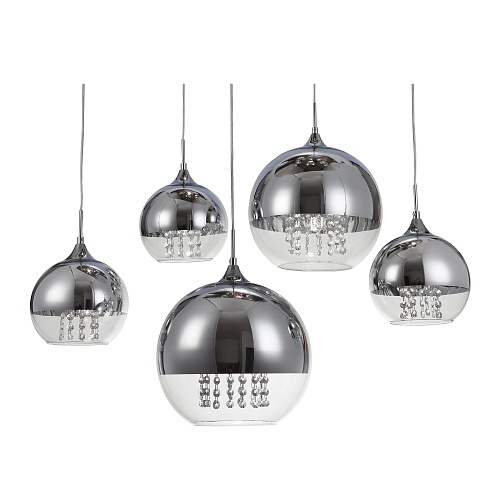 Арматура из металла в двух оттенках: никель и золото. Часть плафона выполнена из металла в тон арматуре, другая часть — из прозрачного стекла. Декоративные подвески внутри плафонов. Регулируемая высота.