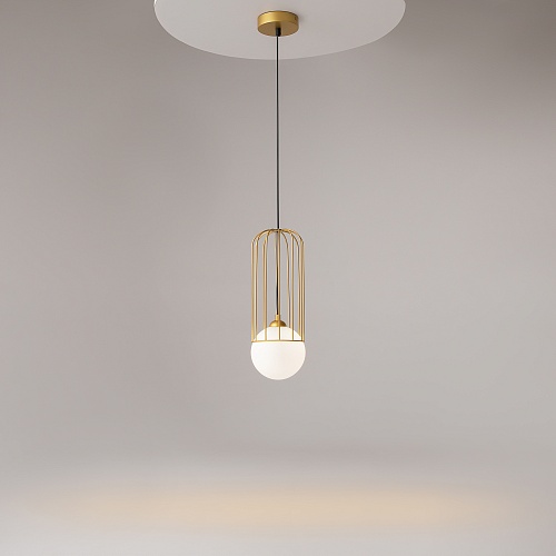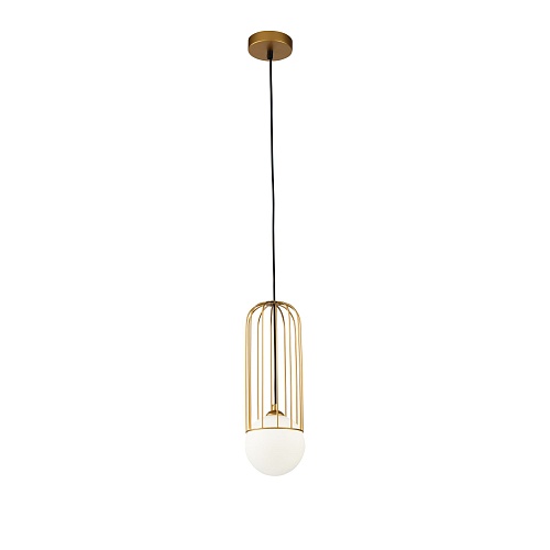 Арматура из металла в золотом цвете. Плафон из матового белого стекла. Декор плафона Telford — решетка из стальной проволоки в тон арматуре. Регулируемая высота.