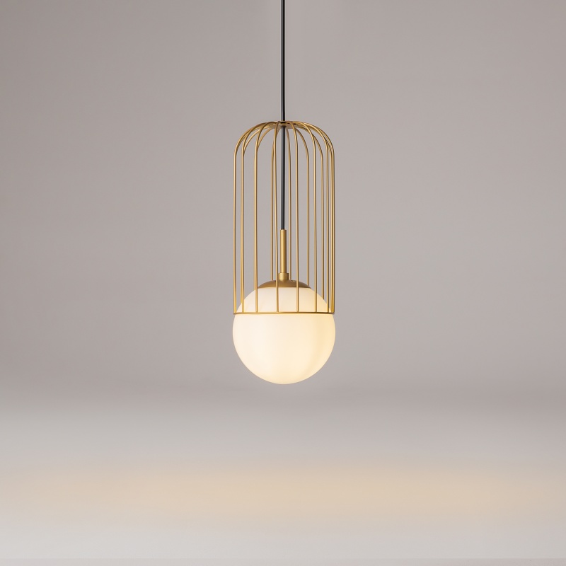 Арматура из металла в золотом цвете. Плафон из матового белого стекла. Декор плафона Telford — решетка из стальной проволоки в тон арматуре. Регулируемая высота.